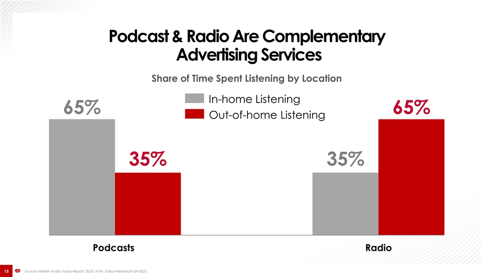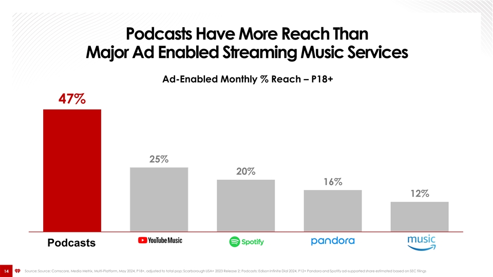 播客的影响力超过了主要的广告支持的流媒体音乐服务广告支持的月度影响力百分比– P18 + 47% 25% 20% 16% 12% Podcasts YouTube Music Spotify Pandora Amazon Music Podcasts来源:来源:康姆斯克,Media Metrix,Multi-Platform,2024年5月,P18 +,调整为总流行音乐;Scarborough USA + 2023 Release 2;Podcasts:Edison Infinite Dial 2024,P12 + Pandora和Spotify广告支持的份额根据SEC文件估计14