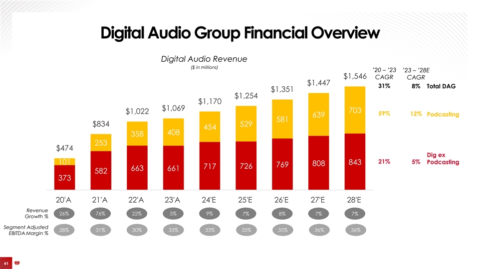 数字音频集团财务概览数字音频收入(百万美元)‘20 –’23‘23 –’28E $ 1,546 CAGR $ 1,44731% 8%总DAG $ 1,351 $ 1,254 $ 1,170 $ 1,069703 $ 1,02259% 12% Podcasting 639581 $ 834529454408358253 $ 474 Dig ex 21% 5% 5% Podcasting 101843808769726717663661582373 20‘A 21’A 22‘A 23’A 24‘E 25’E 26‘E 27’E 28 ' E收入26% 76% 22% 5% 9% 7% 8% 7% 7%增长%分部调整28% 31% 30% 33% 33% 35% 35% 36% 36% EBITDA利润率% 4141