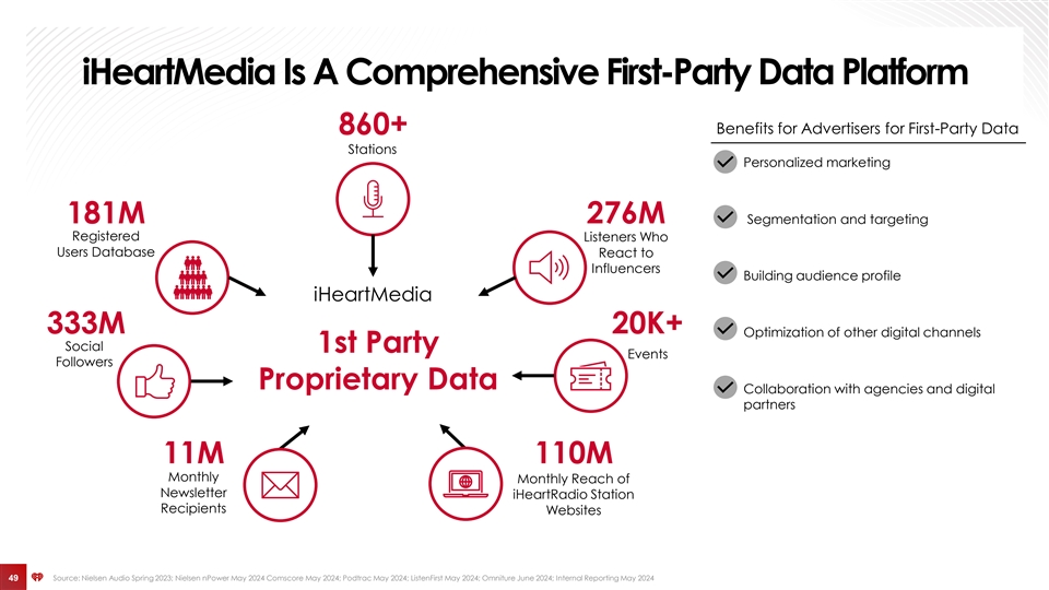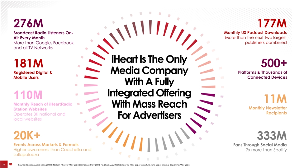 每月2.76亿1.77亿美国播客下载广播电台听众-每月超过后两大Air出版商的总和超过谷歌,Facebook和所有电视网络iHeart是唯一的500 + 1.81亿平台&数千家注册数字和媒体公司连接的设备移动用户,提供完全集成的提供110m 11m每月iHeartRadio与Mass Reach每月通讯电台网站运营3k全国和接收者运营3k全国和地方网站广告商地方网站20k + 333m跨市场活动&通过社交媒体格式粉丝比Coachella更高的知名度并且是Spotify Lollapalooza 12的7倍来源:Nielsen Audio Spring 2023;Nielsen nPower 2024年5月康姆斯克 2024年5月;Podtrac 2024年5月;ListenFirst 2024年5月;Omniture 2024年6月;内部报告2024年5月