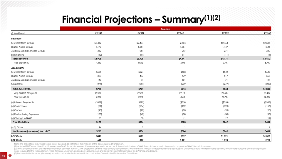 (1)(2)财务预测–摘要预测(百万美元)FY‘24E FY’25E FY‘26E FY’27E FY'28E收入:Multiplatform Group $ 2,412 $ 2,4042,504 $ 2,464 $ 2,583 Digital Audio Group 1,1701,2541,3511,4471,546 Audio & Media Services Group 332261297271332 Eliminations(10)(11)(11)(11)Total revenue $ 3,905 $ 3,908 $ 4,141 $ 4,171 $ 4,450 YoY growth % 4.1% 0.1% 5.9% 0.7% 6.7% Adj. EBITDA:Multiplatform Group $ 501 $ 524 $ 603 $ 542 $ 640 Digital Audio Group$ 853 $ 1,042 Adj. EBITDA Margin % 19.2% 19.7% 22.1% 20.5% 23.4% YoY growth % 7.6% 2.8% 18.6%(6.7%)22.1%(-)利息支出($ 387)($ 371)($ 358)($ 354)($ 353)(-)现金税(31)(104)(132)(123)(156)(-)资本支出(95)(90)(90)(90)(-)重组费用(100)(40)(30)(30)(-)NWC 3338(1)12(11)自由现金流变化$ 170 $ 204 $ 303 $ 269 $ 401(+/-)其他942111现金净增(减)↓ $ 265 $ 206 $ 304 $ 269上面显示的预测是现状,并不反映预期交易的影响。(1)调整后EBITDA和自由现金流是非公认会计准则财务指标。请参阅附录,了解历史非GAAP财务指标与其最具可比性的GAAP财务指标的对账情况。(2)公司无法在没有不合理努力的情况下提供其非公认会计原则预测与最直接可比的公认会计原则措施之间的调节,因为它无法合理确定地预测调节所需的某些重要项目的最终结果。这些项目是不确定的,取决于各种因素,可能会对GAAP报告的结果产生重大影响。(3)指合并现金流量表中现金、现金等价物和受限制现金的净增加(减少)额。55