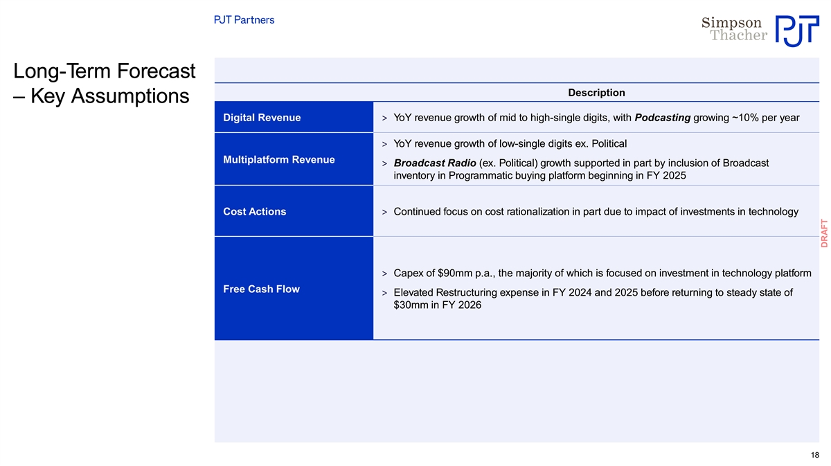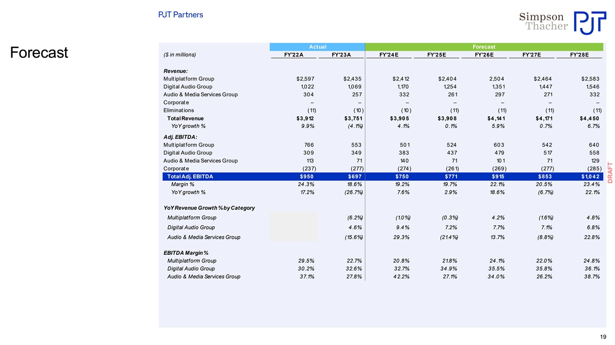 长期预测说明–关键假设数字收入>同比收入增长中高个位数,播客每年增长~10% >同比收入增长低个位数ex。政治多平台收入>广播电台(例如政治)增长部分得到支撑,部分原因是从2025财年开始将广播库存纳入程序化购买平台成本行动>继续关注成本合理化,部分原因是技术投资的影响>资本支出为每年90mm,其中大部分集中在对技术平台自由现金流的投资上> 2024财年和2025财年重组费用增加,然后在2026财年恢复到30mm的稳定状态18