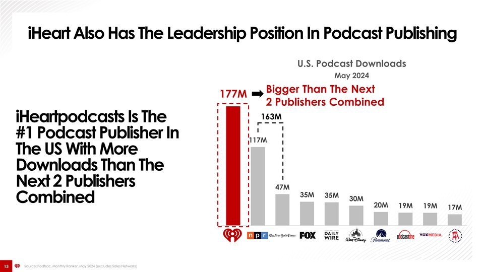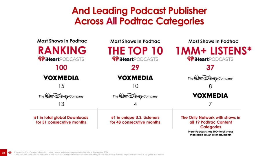 和所有Podtrac类别的领先播客发行商Podtrac中的大多数节目Podtrac中的大多数节目Podtrac中的大多数节目排名前10 1mm +收听*按类别1002937151081347 # 1的全球总下载量# 1在独特的美国听众中是唯一连续51个月连续48个月有节目的网络所有19个Podtrac内容类别iHeartPodcasts有100 +的总节目达到1mm +听众/月来源:PodtracCategory Rankers‘1mm + Listens’表示平均每月收听,2024年9月23*仅包括出现在Podtrac Category Ranker中的播客——按类型划分的一个月内美国收听播客最多的前30名的行业排名