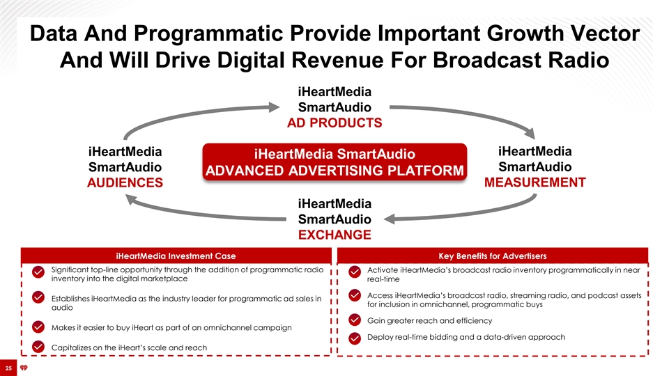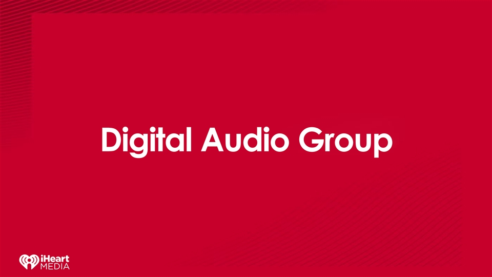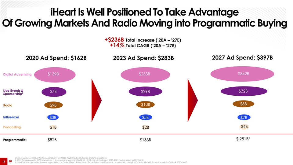 iHeart处于有利地位,可以利用不断增长的市场和无线电进入程序化购买+ $ 236B总增长(‘20A –’27E)+ 14%总复合年增长率(‘20A –’27E)2027年广告支出:$ 397B 2020年广告支出:$ 162B 2023年广告支出:$ 283B $ 342B $ 139B $ 233B数字广告直播活动& $ 32B $ 7B $ 29B 2赞助$ 8B $ 10B电台$ 9B影响者$ 3B $ 5B $ 7B $ 4B播客$ 1B $ 2B $ 16B 1 $ 251B程序化:$ 82B $ 133B资料来源:MAGNA Global Ad Forecast(Summer 2024),PWC Media Outlooks,Statista,eMarketer 1。2027年程序化TAM以15.5%的5年程序化复合年增长率增长,使用2020-2025年计算,并应用于2022年数据192。现场活动和赞助显示基于现场音乐门票销售的全球TAM和使用PWC Global Entertainment & Media Outlook 2023 – 2027的现场音乐赞助