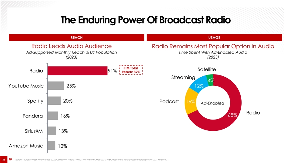 广播电台REACH USAGE电台的持久力量引领音频观众电台仍然是音频中最受欢迎的选择广告支持的每月达到%美国人口花费在广告支持的音频上的时间(2023)(2023)iHM总卫星电台91%达到:89%流媒体4% outube音乐25% 12% Spotify 20% Podcast 1% Ad-enabled Radio % Pandora 1% Sirius M 1% Amazon Music 12% 31来源:来源:Nielsen Audio Today 2023;康姆斯克,Media Metrix,Multi-Platform,May 2024,P18 +,调整为总流行;Scarborough USA + 2023 Release 2