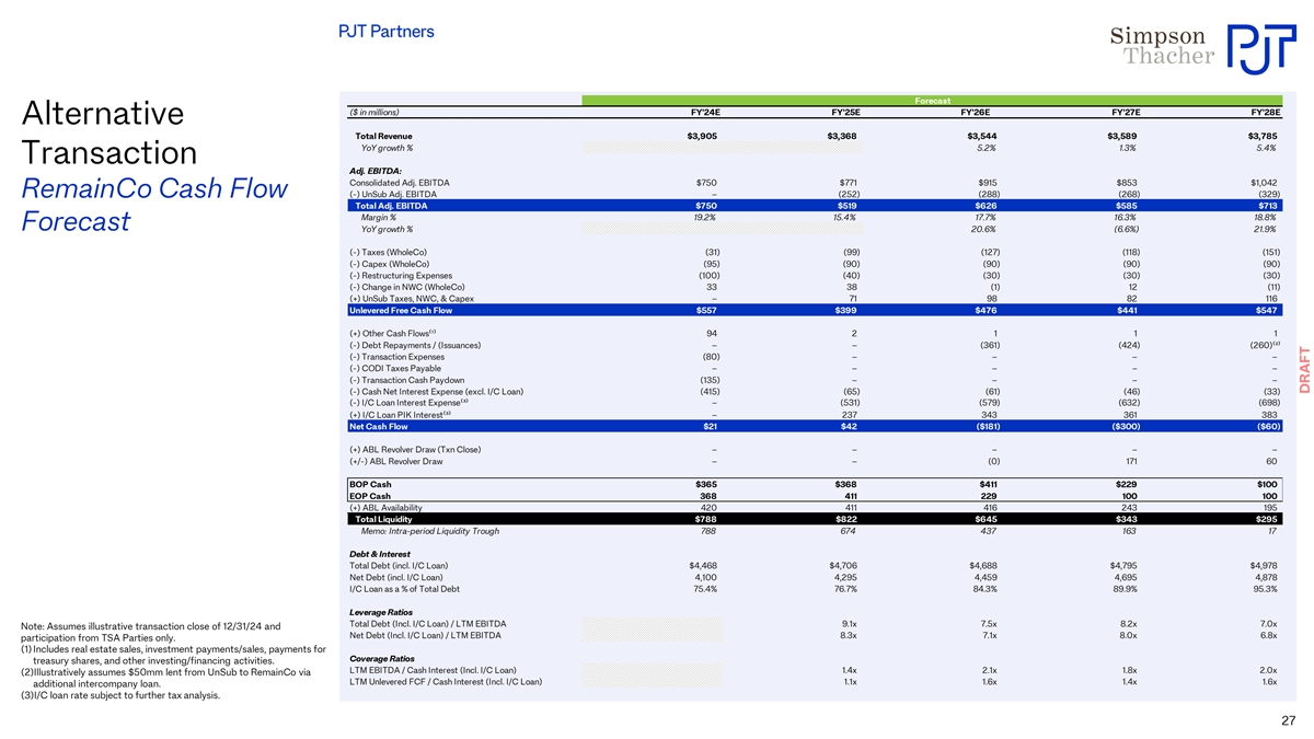 预测(百万美元)FY‘24E FY’25E FY‘26E FY’27E FY'28E Alternative Total Revenue $ 3,905 $ 3,368 $ 3,544 $ 3,589 $ 3,785 YoY成长% 5.2% 1.3% 5.4% Transaction Adj. EBITDA:Consolidated Adj. EBITDA $ 750 $ 771 $ 915 $ 853 $ 1,042(-)UnSub Adj. EBITDA –(252)(288)(268)(329)RemainCo Cash Flow Total Adj. EBITDA $ 750 $ 519 $ 626 $ 585 $ 713 Margin % 19.2% 15.4% 17.7% 16.3% 18.8% Forecast YoY growth % 20.6%(6.6%)21.9%(-)Taxes(Whole12(11)(+)UnSub Taxes,NWC,& Capex – 719882116无杠杆自由现金流$ 557 $ 399 $ 476 $ 441 $ 547(+)其他现金流丨丨942111(-)债务偿还/(发行)––(361)(424)(260)²(-)交易费用(80)–– ––(-)CODI应付税款–– ––(-)交易现金支付(135)–– ––(-)现金净利息支出(不包括。I/C贷款)(415)(65)(61)(46)(33)(-)I/C贷款利息费用–(531)(579)(632)(698)(+)I/C贷款PIK利息Volve – 237343361383净现金流$ 21 $ 42($ 181)($ 300)($ 60)(+)ABL Revolver Draw(TXN Close)–– ––(+/-)ABL Revolver Draw –(0)17160 BOP Cash $ 365 $ 368 $ 411 $ 229 $ 100 EOP Cash 368411229100100(+)ABL availability 420411416243195 Total Liquidity $ 788 $ 822 $ 645 $ 343 $ 295备忘录I/C贷款)$ 4,468 $ 4,706 $ 4,688 $ 4,795 $ 4,978净债务(含I/C贷款)4,1004,2954,4594,6954,878 I/C贷款占总债务的百分比75.4% 76.7% 84.3% 89.9% 95.3%杠杆率总债务(含I/C贷款)/LTM EBITDA 9.1x 7.5x 8.2x 7.0x注:假设说明性交易收盘价为12/31/24和净债务(包括I/C贷款)/LTM EBITDA 8.3x 7.1x 8.0x 6.8x仅来自TSA缔约方的参与。(1)包括房地产销售、投资支付/销售、支付覆盖率库存股、其他投资/融资活动。LTM EBITDA/现金利息(含I/C贷款)1.4x 2.1x 1.8x 2.0x(2)说明性地假设UNSub通过LTM无杠杆FCF/现金利息(包括。I/C贷款)1.1x 1.6x 1.4x 1.6x额外公司间贷款。(3)I/C贷款费率需进一步纳税分析。27
