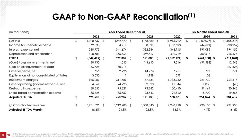 (1)GAAP与Non-GAAP对账(千)截至12月31日止年度、截至2023年6月30日止六个月20222021202020242023净亏损$(1,100,339)$(262,670)$(158,389)$(1,915,222)$(1,000,097)$(1,105,345)所得税(福利)费用(62,338)4,7198,391(183,623)(44,621)(20,252)利息支出净额389,775341,674332,384343,745191,092194,150折旧及摊销428,483445,664469,417402,929209,518216,577 EBITDA $(344,419)$ 529,387 $ 6净额28,1301,045(43,643)9,346(91,582)12,543债务清偿收益(56,724)(30,214)---(27,527)其他费用净额6552,29514,9767,751727371非合并关联公司亏损权益3,530111,1383791064减值费用965,087311,48957,7341,738,752921,732964,517其他经营(收入)费用,净额4,36124,99832,3211,3441,088(40)重组费用60,35375,82173,262100,41051,16130,243股份补偿费用35,62535,45723,54322,86215,70019,364调整后EBITDA $ 696,598 $ 950,289 $ 811,133 $ 538,673 $ 254,824 $ 284,605(/)合并收入$ 3,751,025 $ 3,912,283 $ 3,558,340 $ 2,948,218 $ 1,728,130 $ 1,731,253调整后EBITDA利润率18.6% 24.3% 22.8% 18.3% 14.7% 16.4%(1)公司无法提供其非公认会计原则预测之间的调节和最直接可比的GAAP措施,而无需做出不合理的努力,因为它无法以合理的确定性预测对账所需的某些重要58项的最终结果。这些项目是不确定的,取决于各种因素,可能会对GAAP报告的结果产生重大影响。
