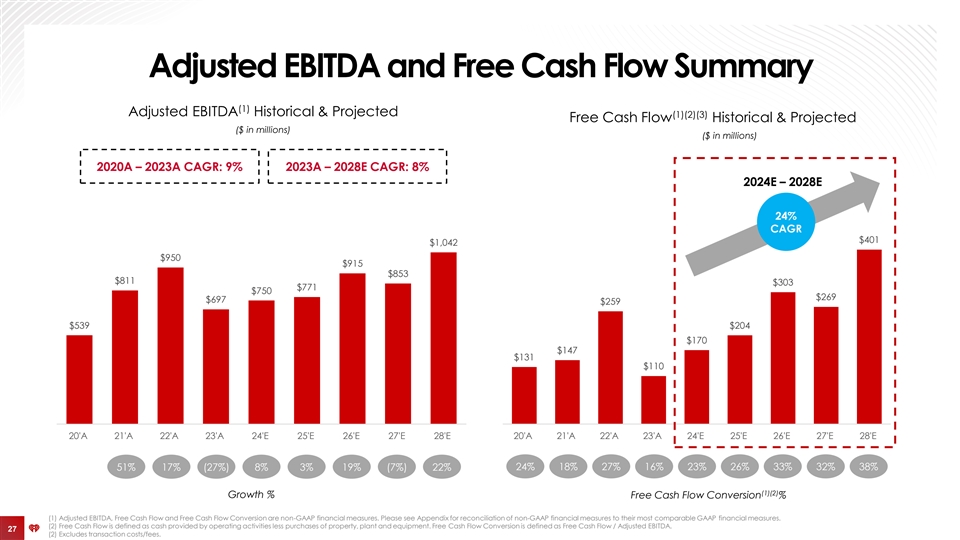 经调整EBITDA和自由现金流概要(1)调整后EBITDA历史和预计(1)(2)(3)自由现金流历史和预计(百万美元)(百万美元)2020A – 2023A CAGR:9% 2023A – 2028E CAGR:8% 2024E – 2028E 24% CAGR $ 401 $ 1,042 $ 950 $ 915 $ 853 $ 811 $ 303 $ 771 $ 750 $ 269 $ 697 $ 259 $ 539 $ 204 $ 170 $ 147 $ 131 $ 110 $ 110 $ 110‘A 21’A 22‘A 23’A 24‘E 25’E 26‘E 27’E 28‘E 20’A 21‘A 22’A 23‘A 24’E 25‘E 26’E 27‘E 28’E 51% 17%(27%)8% 3% 19%(7%)22% 24% 18% 27% 16% 23(1)调整后EBITDA、自由现金流和自由现金流转换是非公认会计准则财务指标。请参阅附录,了解非GAAP财务指标与其最具可比性的GAAP财务指标的对账情况。(2)自由现金流定义为经营活动提供的现金减去购买物业、厂房和设备。自由现金流转换定义为自由现金流/调整后EBITDA。2727(2)不包括交易费用/费用。
