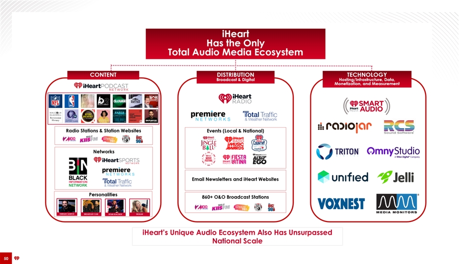 iHeartMedia是面向广告主的综合第一方数据平台福利第一方数据860 +台•个性化营销c 181m 276m •对用户数据库对c影响者做出反应的注册听众进行细分和定位•建立受众档案c丨iHeartMedia iHeartMedia 333m 20K + •优化其他数字渠道社交1st派对活动跟随者c专有数据•与代理机构的协作和数字合作伙伴每月1100万110m的月覆盖率c c时事通讯iHeartRadio Station接收方网站4949来源:Nielsen Audio Spring 2023;Nielsen nPower 2024年5月康姆斯克 2024年5月;Podtrac 2024年5月;ListenFirst 2024年5月;Omniture 2024年6月;内部报告2024年5月