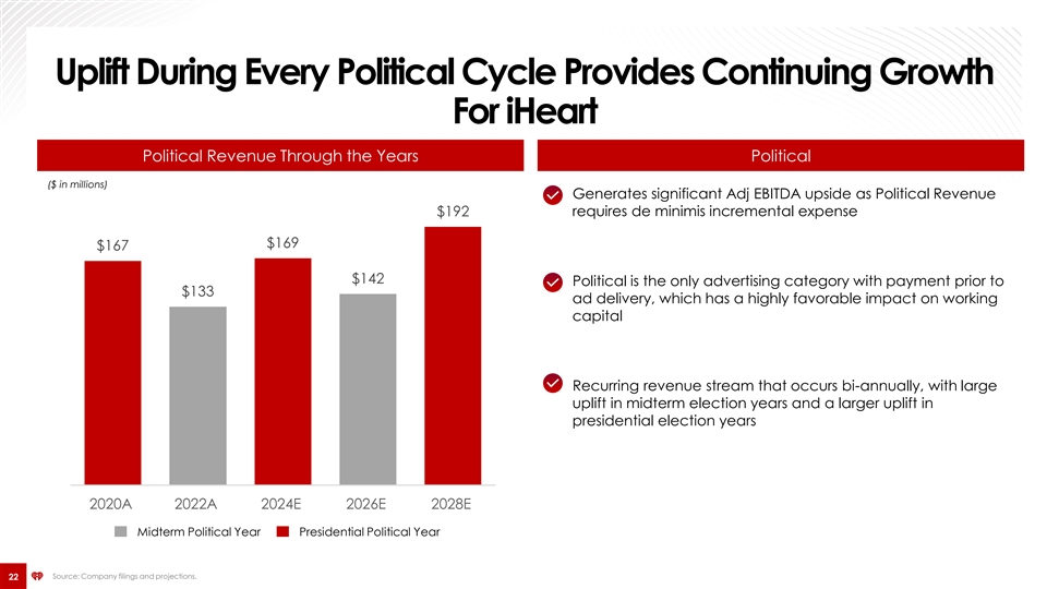 每个政治周期期间的提升为iHeart政治收入提供了持续增长政治年度(百万美元)•产生显着的调整后EBITDA上行空间,因为政治收入192美元需要微量增量费用169美元167美元142美元•政治是唯一在133美元广告投放之前付费的广告类别,这对营运资金产生了非常有利的影响•每两年发生一次的经常性收入流,在中期选举年有较大的提升,而在总统选举年有较大的提升2020A 2022A 2024E 2026E 2028E中期政治年度总统政治年度来源:公司文件和预测。22