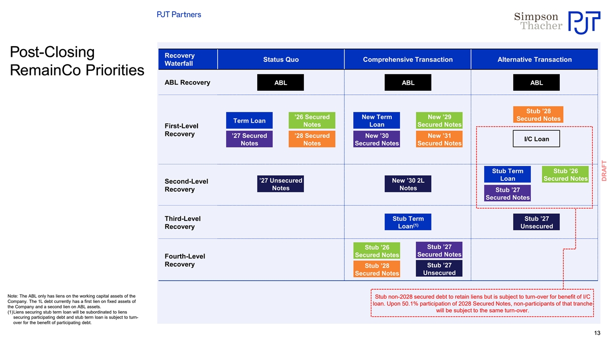 收盘后回收现状综合交易替代交易瀑布仍为共同优先事项ABL回收ABL ABL ABL Stub‘28’26有担保新期限新‘29有担保票据定期贷款票据贷款有担保票据一级回收’27有担保新‘30新’31 I/C贷款票据票据有担保票据有担保票据存根期限存根‘26贷款有担保票据’27无担保新‘30 2L二级票据票据回收存根’27有担保票据三级存根期限存根‘27(1)贷款无担保回收存根’27存根‘26有担保票据有担保票据第四级回收存根’27存根' 28无担保有担保票据注:仅ABL对Stub非2028有担保债务的营运资金资产拥有留置权以保留留置权,但可能会因I/C公司的利益而被移交。1L债目前有贷款固定资产的第一留置权。在2028年有担保票据的50.1%参与下,该部分公司的非参与者和ABL资产的第二留置权。将受到相同的转换。(1)为存根定期贷款提供担保的留置权将从属于为参与债务提供担保的留置权,而存根定期贷款须为参与债务的利益进行周转。1 13 3