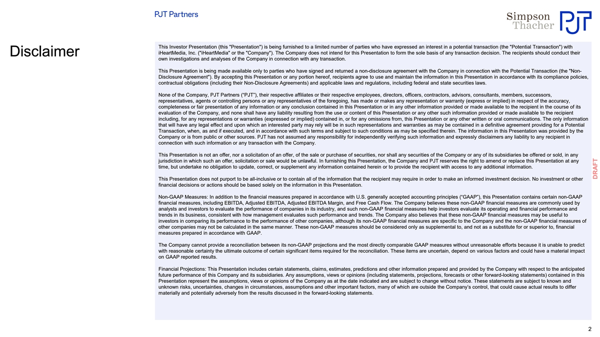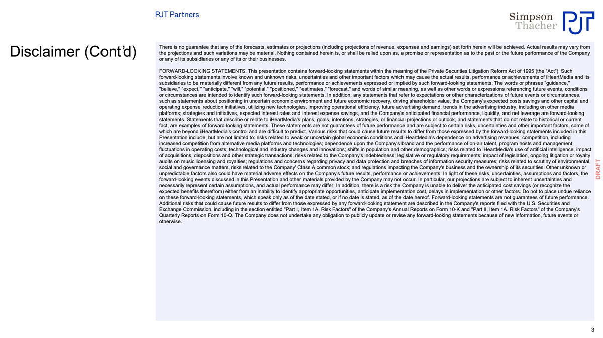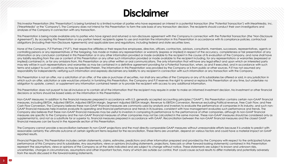 本投资者介绍会(本介绍会)是向对与iHeartMedia,Inc.(iHeartMedia或公司)的潜在交易(潜在交易)表示感兴趣的有限数量的各方提供的。公司不打算让本演示文稿成为任何交易决定的唯一依据。收件人应就任何交易对公司进行其免责声明自己的调查和分析。本演示文稿仅提供给已与公司就潜在交易签署并交回保密协议(保密协议)的各方。通过接受本演示文稿或本演示文稿的任何部分,收件人同意根据其合规政策、合同义务(包括其保密协议)和适用的法律法规(包括联邦和州证券法)使用和维护本演示文稿中的信息。公司、PJT合作伙伴(“PJT”)、其各自的关联公司或各自的雇员、董事、高级职员、承包商、顾问、顾问、成员、继任者、代表、代理人或控制人或上述任何代表,均未就本演示文稿或在其对公司进行评估过程中向收件人提供或提供的任何其他信息中所载的任何信息或任何结论的准确性、完整性或公平列报作出任何陈述或保证(明示或暗示),任何人均不承担因使用或内容本演示文稿或向收件人提供或提供的任何其他此类信息而导致的任何责任,包括因本演示文稿或任何其他书面或口头通信中包含的任何陈述或保证(明示或暗示)或因其任何遗漏而导致的任何责任。唯一具有任何法律效力且利害关系方可能依赖的信息将包含在规定潜在交易的最终协议中可能包含的陈述和保证中,当、如同和如果执行时,并根据其中可能指定的条款和条件。本演示文稿中的信息由公司提供或来自公开或其他来源。PJT不承担任何独立核实此类信息的责任,并明确表示不对任何接收者承担与此类信息或与公司的任何交易有关的任何责任。本演示文稿不是出售或购买证券的要约,也不是要约的招揽,也不应在此类要约、招揽或出售为非法的任何司法管辖区提供或出售公司或其任何子公司的任何证券。在提供本演示文稿时,公司和PJT保留随时修改或替换本演示文稿的权利,但不承担更新、更正或补充此处包含的任何信息的义务,也不向收件人提供访问任何额外信息的权限。本演示文稿并不旨在包罗万象,也不包含收件人为做出知情投资决定可能需要的所有信息。任何投资或其他财务决策或行动都不应仅基于本演示文稿中的信息。非GAAP指标:除了根据美国公认会计原则(“GAAP”)编制的财务指标外,本演示文稿还包含某些非GAAP财务指标,包括EBITDA、调整后EBITDA、调整后EBITDA利润率和自由现金流。该公司认为,分析师和投资者通常使用这些非GAAP财务指标来评估其所在行业公司的业绩,此类非GAAP财务指标有助于投资者评估其运营和财务业绩以及业务趋势,与管理层评估此类业绩和趋势的方式一致。该公司还认为,这些非美国通用会计准则财务指标可能有助于投资者将其业绩与其他公司的业绩进行比较,尽管其非美国通用会计准则财务指标是公司特有的,其他公司的非美国通用会计准则财务指标可能不会以同样的方式计算。这些非公认会计原则措施应仅被视为对根据公认会计原则编制的财务措施的补充,而不是替代或优于这些措施。该公司无法在没有不合理努力的情况下提供其非公认会计原则预测与最直接可比的公认会计原则措施之间的对账,因为它无法以合理的确定性预测对账所需的某些重要项目的最终结果。这些项目是不确定的, 取决于各种因素,可能会对GAAP报告的结果产生重大影响。财务预测:本演示文稿包括公司就本公司及其子公司的预期未来业绩编制和提供的某些陈述、索赔、估计、预测和其他信息。本演示文稿中包含的任何假设、观点或意见(包括陈述、预测、预测或其他前瞻性陈述)均代表公司在所示日期的假设、观点或意见,如有更改,恕不另行通知。这些陈述受到已知和未知风险、不确定性、环境变化、假设和其他重要因素的影响,其中许多因素超出了公司的控制范围,可能导致实际结果与前瞻性陈述中讨论的结果存在重大差异,并可能产生不利影响。2