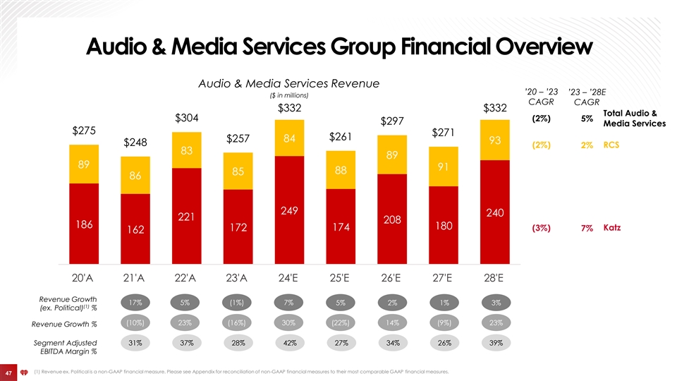 音频和媒体服务集团财务概览音频和媒体服务收入‘20 –’23‘23 –’28E(百万美元)CAGR $ 332 $ 332总音频& $ 304(2%)5% $ 297媒体服务$ 275 $ 271 $ 261 $ 2578493 $ 248(2%)RCS2 % 83898991888566249240221208186180 Katz 172174(3%)7% 162 20‘A 21’A 22‘A 23’A 24‘E 25’E 26‘E 27’E 28 ' E收入增长17% 5%(1%)7% 5% 2% 1% 3%(1)(ex。政治)%(10%)23%(16%)30%(22%)14%(9%)23%收入增长%分部调整后31% 37% 28% 42% 27% 34% 26% 39% EBITDA利润率%(1)收入ex。政治是一种非公认会计准则的财务指标。请参阅附录,了解非GAAP财务指标与其最具可比性的GAAP财务指标的对账情况。47 47
