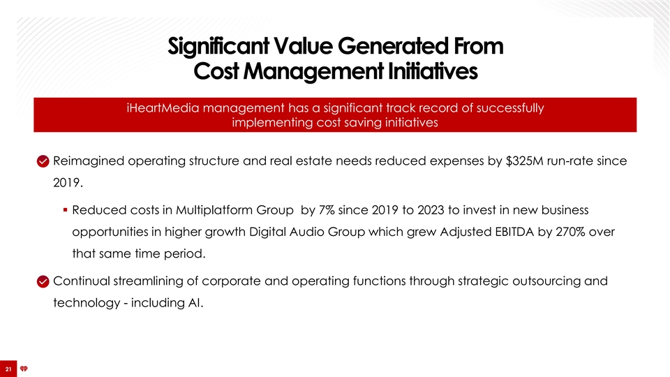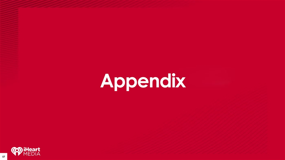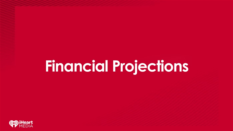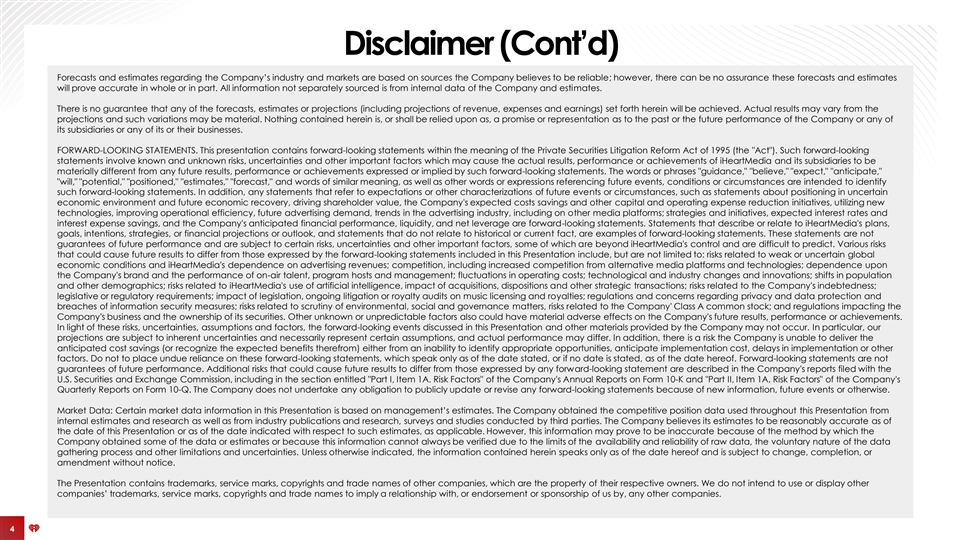 无法保证本文所述的任何预测、估计或预测(包括对收入、费用和收益的预测)将会实现。实际结果可能与预测不同,这种变化可能是重大的。此处所载的任何内容均不是或不应被视为对公司免责声明(续)或其任何子公司或其任何业务的过去或未来业绩的承诺或陈述。前瞻性陈述。本演示文稿包含1995年《私人证券诉讼改革法案》(该法案)含义内的前瞻性陈述。此类前瞻性陈述涉及已知和未知的风险、不确定性和其他重要因素,可能导致iHeartMedia及其子公司的实际结果、业绩或成就与此类前瞻性陈述明示或暗示的任何未来结果、业绩或成就存在重大差异。指导、相信、预期、预期、将、潜在、定位、估计、预测和类似含义的词语,以及引用未来事件、条件或情况的其他词语或表达,旨在识别此类前瞻性陈述。此外,任何提及对未来事件或情况的预期或其他特征的陈述,例如关于在不确定的经济环境和未来经济复苏中的定位、推动股东价值、公司预期的成本节约和其他资本和运营费用削减举措、利用新技术、提高运营效率、未来广告需求、广告行业趋势,包括在其他媒体平台上的趋势的陈述;战略和举措、预期利率和利息费用节约,以及公司预期的财务业绩、流动性和净杠杆的陈述均为前瞻性陈述。描述或涉及iHeartMedia的计划、目标、意图、战略或财务预测或前景的陈述,以及与历史或当前事实无关的陈述,均为前瞻性陈述的示例。这些陈述并非对未来业绩的保证,并受到某些风险、不确定性和其他重要因素的影响,其中一些风险、不确定性和因素超出了iHeartMedia的控制范围,且难以预测。可能导致未来结果与本演示文稿中包含的前瞻性陈述所表达的结果不同的各种风险包括但不限于:与疲软或不确定的全球经济状况以及iHeartMedia对广告收入的依赖相关的风险;竞争,包括来自替代媒体平台和技术的竞争加剧;对公司品牌以及直播人才、节目主持人和管理层表现的依赖;运营成本波动;技术和行业变革与创新;人口和其他人口结构的变化;与iHeartMedia使用人工智能相关的风险、收购的影响,处置和其他战略交易;与公司债务相关的风险;立法或监管要求;立法、正在进行的诉讼或版税审计对音乐许可和版税的影响;有关隐私和数据保护以及违反信息安全措施的法规和担忧;与环境、社会和治理事项的审查相关的风险,与公司A类普通股相关的风险;以及影响公司业务及其证券所有权的法规。其他未知或不可预测的因素也可能对公司未来的业绩、业绩或成就产生重大不利影响。鉴于这些风险、不确定性、假设和因素,本演示文稿和公司提供的其他材料中讨论的前瞻性事件可能不会发生。特别是,我们的预测受到固有不确定性的影响,必然代表某些假设,实际表现可能有所不同。此外,由于无法识别适当机会、预测实施成本、实施延迟或其他因素,公司存在无法实现预期成本节约(或确认由此带来的预期收益)的风险。不要过分依赖这些前瞻性陈述,这些陈述仅代表所述日期,或者如果没有说明日期,则截至本文所述日期。前瞻性陈述并非对未来业绩的保证。可能导致未来结果与任何前瞻性陈述所表达的结果不同的其他风险在公司提交给美国证券交易委员会的报告中进行了描述,包括标题为第I部分第1A项的部分。公司年报10-K表格及第II部分的风险因素, 项目1a。表格10-Q的公司季度报告的风险因素。公司不承担因新信息、未来事件或其他原因而公开更新或修改任何前瞻性陈述的任何义务。3