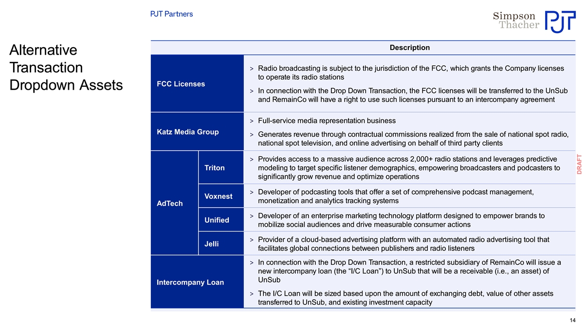 说明替代方案>无线电广播受FCC管辖,FCC授予公司许可交易以运营其广播电台FCC许可下拉资产>就下拉交易而言,FCC许可将转让给UNSub,RemainCo将有权根据公司间协议使用此类许可>全服务媒体代理业务Katz Media Group >通过销售国家现场广播、国家现场电视实现的合同佣金产生收入,和代表第三方客户的在线广告>通过2000多个广播电台提供对海量受众的访问,并利用预测性Triton建模来针对特定的听众人群,使广播公司和播客能够显着增加收入并优化运营>提供一套全面的播客管理的播客工具开发商,Voxnest货币化和分析跟踪系统AdTech >企业营销技术平台的开发商,该平台旨在使品牌能够统一动员社会受众并推动可衡量的消费者行动>基于云的广告平台的提供商,该平台具有自动广播广告工具,Jelli可促进出版商和广播听众之间的全球联系>就Drop Down交易而言,RemainCo的一家受限制子公司将向UNSub发放一笔新的公司间贷款(“I/C贷款”),这将是一笔应收款项(即,UNSub公司间贷款的一项资产)>该I/C贷款将根据交换债务的金额、转移到UNSub的其他资产的价值以及现有投资能力确定规模14