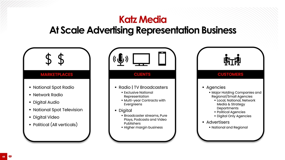 Katz Media At Scale Advertising Representation Business MarketPlaces Clients Customers▪全国现货电台▪电台|电视广播员▪机构▪独家国家▪主要控股公司和▪网络无线电代表区域/小型机构▪多年期合同▪地方、国家、网络▪Digital Audio Evergreens Media & Strategy Departments▪国家现货电视台▪数位▪政治机构▪广播流,纯▪仅限数字机构▪数字视频播放、播客和视频▪广告商发布者▪政治(所有垂直领域)▪利润率较高的业务▪国家和地区44