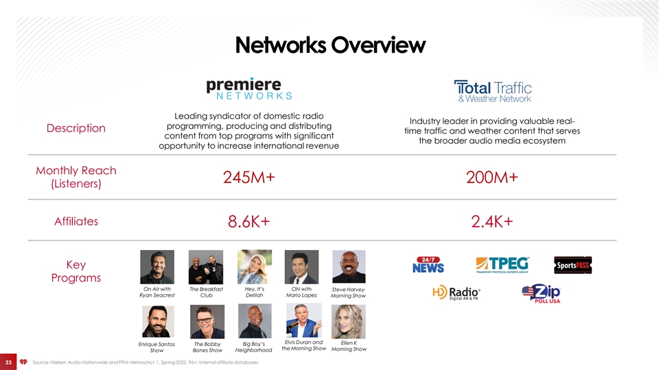 网络概述国内无线电行业领导者提供有价值的真实节目、制作和分发描述时间流量和天气内容的领先辛迪加,服务于顶级节目的内容,具有显著的更广泛的音频媒体生态系统机会,每月增加国际收入达到245M + 200M +(听众)附属8.6K + 2.4K +与早餐一起播出的关键节目嘿,Steve Harvey Ryan Seacrest Club Delilah Mario Lopez Morning Show Elvis Duran和Ellen K Enrique Santos The Bobby Big Boy's the Morning Show Morning Show Neighborhood Show Bones Show 3333来源:Nielsen Audio Nationwide和PPM Metros/Act 1,2022 Spring,P6 +;内部附属数据库