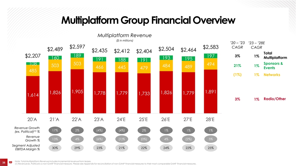 多平台集团财务概览多平台收入(百万美元)‘20 –’23‘23 –’28E $ 2,597 $ 2,583 CAGR $ 2,504 $ 2,489 $ 2,464 $ 2,435 $ 2,412 $ 2,404合计1893% 1% $ 2,207197多平台160193195191188191赞助商& 50310849450348421% 1% 489466445事件479485(1%)1%网络1,9051,8911,8261,8261,7781,7791,7791,7791,791,7331,614无线电/其他3% 1% 20‘A 21’A 22‘A 23’A 24‘E 25’E 26‘E 27’E 28 ' E收入增长17% 2%(4%)(4%)2% 1% 1% 1%(1)(政治)%收入13% 4%(6%)(1)%(0%)4%(2%)5%增长%分部调整后30% 29% 23% 21% 22% 24% 22% 22% 25% EBITDA利润率%注:多平台总收入包括来自租赁的增量收入。3535(1)收入ex。政治是一种非公认会计准则的财务指标。请参阅附录,了解非GAAP财务指标与其最具可比性的GAAP财务指标的对账情况。
