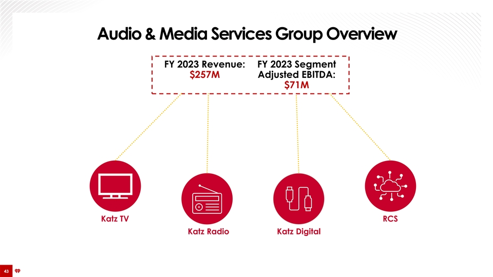 音频和媒体服务集团概览2023财年收入:2023财年部门2.57亿美元调整后EBITDA:7100万美元Katz TV RCS Katz Radio Katz Digital 43