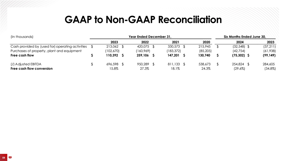 GAAP与Non-GAAP对账(千)截至12月31日止年度、截至2023年6月30日止六个月20222021202020242023经营活动(用于)提供的现金213,062美元420,075美元330,573美元215,945美元(32,548)美元(37,211)购买物业、厂房和设备(102,670)(160,969)(183,372)(85,205)(42,754)(61,938)自由现金流110,392美元259,106美元147,201美元130,740美元(75,302)美元(99,149)(/)调整后EBITDA 696,598美元950,289美元811,133美元538,673美元254,824美元284,605美元自由现金流转换15.8% 27.3% 18.1%
