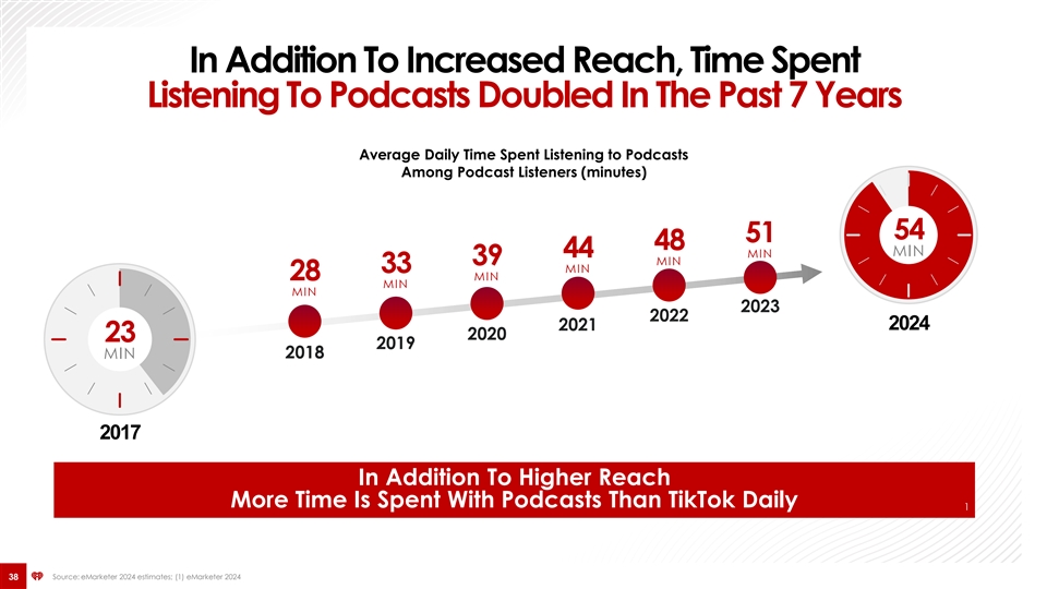 除了覆盖面扩大外,过去7年,播客听众收听播客所用的时间翻了一番(分钟)545148分钟44分钟39分钟33分钟28分钟28分钟202320222024202120232019分钟20182017除了更高的覆盖面5比TikTok Daily多花在播客上的时间1538来源:eMarketer 2024估计;(1)eMarketer 2024