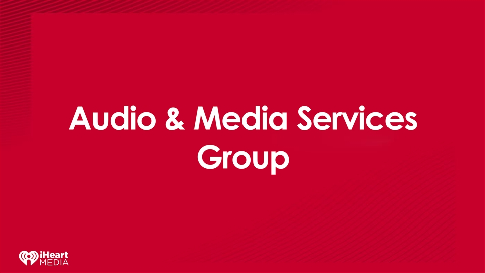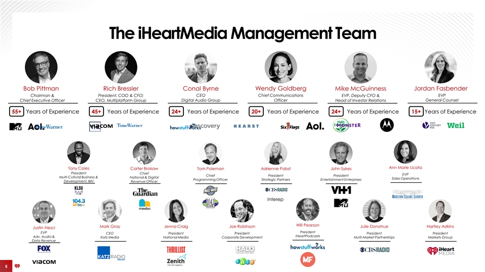 免责声明(续)关于公司行业和市场的预测和估计是基于公司认为的来源;b he owrel ever iabl,e无法保证这些预测和估计将全部或部分证明是准确的。所有未单独来源的信息均来自公司内部数据和估计。无法保证本文所述的任何预测、估计或预测(包括对收入、费用和收益的预测)将会实现。实际结果可能与预测不同,这种变化可能是重大的。本文所载的任何内容均不是或不应被视为关于公司或其任何子公司或其任何业务的过去或未来业绩的承诺或陈述。前瞻性陈述。本演示文稿包含1995年《私人证券诉讼改革法案》(法案)含义内的前瞻性陈述。此类前瞻性陈述涉及已知和未知的风险、不确定性和其他重要因素,可能导致iHeartMedia及其子公司的实际结果、业绩或成就与此类前瞻性陈述明示或暗示的任何未来结果、业绩或成就存在重大差异。指导、相信、预期、预期、将、潜在、定位、估计、预测和类似含义的词语,以及引用未来事件、条件或情况的其他词语或表达,旨在识别此类前瞻性陈述。此外,任何提及对未来事件或情况的预期或其他特征的陈述,例如关于在不确定的经济环境和未来经济复苏中的定位、推动股东价值、公司预期的成本节约和其他资本和运营费用削减举措、利用新技术、提高运营效率、未来广告需求、广告行业趋势,包括在其他媒体平台上的趋势的陈述;战略和举措、预期利率和利息费用节约,以及公司预期的财务业绩、流动性和净杠杆的陈述均为前瞻性陈述。描述或涉及iHeartMedia的计划、目标、意图、战略或财务预测或前景的陈述,以及与历史或当前事实无关的陈述,均为前瞻性陈述的示例。这些陈述不是对未来业绩的保证,并且受到某些风险、不确定性和其他重要因素的影响,其中一些风险、不确定性和因素超出了iHeartMedia的控制范围,也难以预测。可能导致未来结果与本演示文稿中包含的前瞻性陈述所表达的结果不同的各种风险包括但不限于:与疲软或不确定的全球经济状况以及iHeartMedia对广告收入的依赖相关的风险;竞争,包括来自替代媒体平台和技术的竞争加剧;对公司品牌以及直播人才、节目主持人和管理层表现的依赖;运营成本波动;技术和行业变革与创新;人口和其他人口结构的变化;与iHeartMedia使用人工智能相关的风险、收购的影响,处置和其他战略交易;与公司债务相关的风险;立法或监管要求;立法、正在进行的诉讼或版税审计对音乐许可和版税的影响;有关隐私和数据保护以及违反信息安全措施的法规和担忧;与环境、社会和治理事项的审查相关的风险,与公司A类普通股相关的风险;以及影响公司业务及其证券所有权的法规。其他未知或不可预测的因素也可能对公司未来的业绩、业绩或成就产生重大不利影响。鉴于这些风险、不确定性、假设和因素,本演示文稿和公司提供的其他材料中讨论的前瞻性事件可能不会发生。特别是,我们的预测受到固有不确定性的影响,必然代表某些假设,实际表现可能有所不同。此外,由于无法识别适当机会、预测实施成本、实施延迟或其他因素,公司存在无法实现预期成本节约(或确认由此带来的预期收益)的风险。不要过分依赖这些前瞻性陈述,这些陈述仅代表所述日期,或者如果没有说明日期, 截至本报告之日。前瞻性陈述并非对未来业绩的保证。可能导致未来结果与任何前瞻性陈述所表达的结果不同的其他风险在公司提交给美国证券交易委员会的报告中进行了描述,包括标题为第一部分第1A项的部分。公司年度报告10-K表格及第II部分第1A项的风险因素。表格10-Q的公司季度报告的风险因素。公司不承担因新信息、未来事件或其他原因而公开更新或修改任何前瞻性陈述的任何义务。市场数据:本演示文稿中的某些市场数据信息基于管理层的估计。公司ob e tai coned mpetth itive位置数据在整个演示文稿中使用,来自内部估计和研究以及行业出版物和第三方进行的研究、调查和研究。本公司相信,截至本呈报日期或截至就该等估计所指明的日期(如适用),其估计是合理准确的。然而,由于公司获得部分数据或估计的方法,或由于原始数据的可用性和可靠性的限制、数据收集过程的自愿性质以及其他限制和不确定性,这些信息可能被证明是不准确的。除非另有说明,本文所包含的信息仅代表截至本文发布之日的信息,如有更改、完成或修改,恕不另行通知。演示文稿包含其他公司的商标、服务标记、版权和商号,它们是各自所有者的财产。我们不打算使用或展示其他公司的商标、服务标记、版权和商品名称来暗示与nso us b rshi y,p an y其他公司的关系,或背书或恶搞nso us b rshi y,p an y其他公司。4 4