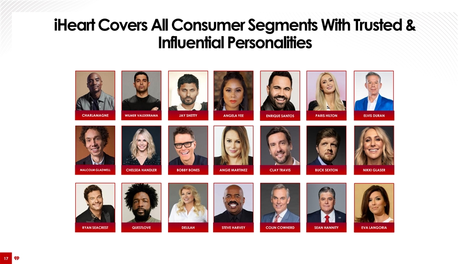 iHeart覆盖所有消费细分市场,拥有值得信赖和有影响力的人物CHARLAMAGNE WILMER VALDRAMA JAY SHETTY ANGELA YEE ENRIQUE SANTOS PARIS HILTON ELVIS DURAN MALCOLM GLADWELL CHELSEA HANDLER BOBY BONES ANGIE MARTINEZ CLY TRAVIS BUCK SEXTON NIKKI GLASER RYAN SEACREST QUestlove DELILAH STEVE HARVEY COLIN COWHERD SEAN HANNITY EVA LANGORIA 17