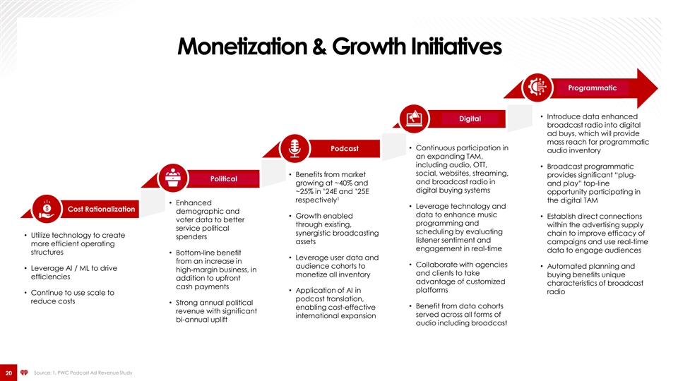 货币化和增长举措程序化•在数字广告购买中引入数据增强型数字广播电台,这将为程序化提供大规模覆盖•持续参与Podcast音频库存和不断扩大的TAM,包括音频、OTT、•广播程序化社交、网站、流媒体,•市场带来的好处提供了显着的“即插即用的政治和广播电台在以~40%的速度增长并播放”的顶级数字购买系统~25%在‘24E和’25E的机会分别参与1个数字TAM •增强•利用技术和成本合理化人口和数据来增强音乐•促进增长•建立直接连接选民数据以更好地编程,并通过现有的,在广告供应服务政治调度中,通过评估协同广播链来提高效率•利用技术创建花钱的听众情绪和资产活动,并在实时数据中使用实时更有效的运营参与来吸引受众结构•底线利益•利用用户数据并从增加•与机构受众群组合作以•自动化规划和•利用AI/ML来推动高利润业务,In and clients to take monetize all stock buying benefits unique efficiencies addition to up-front advantage of customized characteristics of broadcast cash payment • AI applies in platforms radio • continue to use scale to Podcast translation,reduce costs • strong annual political • benefit from data cohorts enabling-co-efficient revenue with significant served across all form of international expansion bi-annual upgrade audio普华永道播客广告收入研究20