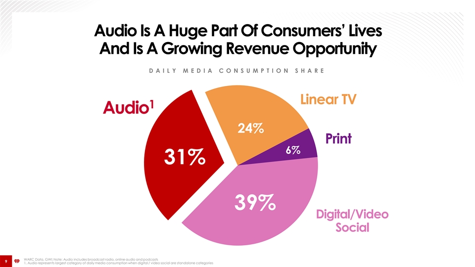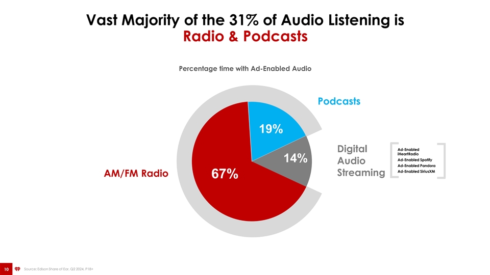 在31%的音频收听中,绝大多数是Radio & Podcasts与Ad-Enabled Audio Podcasts的百分比时间19% Ad-Enabled Digital iHeartRadio Ad-Enabled Spotify 14% Audio Ad-Enabled Pandora Ad-Enabled SiriusXM Streaming AM/FM Radio 67%来源:Edison Share of Ear,Q2 2024,P18 + 10