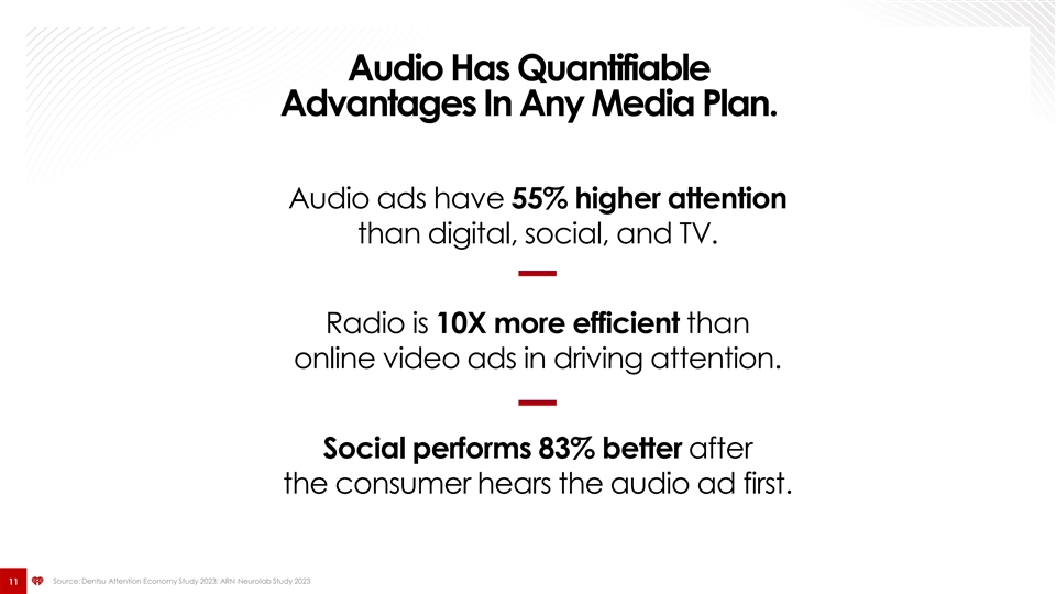 音频在任何媒体计划中都具有可量化的优势。音频广告的关注度比数字、社交和电视高出55%。Radio在吸引注意力方面比在线视频广告效率高10倍。消费者先听到音频广告后,Social的表现要好83%。来源:电通注意力经济研究2023;ARN Neurolab研究202311