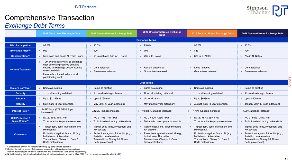 综合交易交换债项条款2027年无担保票据交换2026年定期贷款交换债项2026年有担保票据交换债项2027年有担保票据交换债项2028年有担保票据交换债项债务交换条款最低。参与度> 95.0% > 95.0% > 95.0% > 95.0% > 95.0%(1)兑换价> 99c > 99c > 79c > 88c > 79c(1)代价>现金5c及1L定期贷款94c >现金5c及1L票据94c > 2L票据79c > 1L票据88c > 1L票据79c >先上缴追偿以交换现有担保债务的债务和第二个交换现有的债务>留置权发布>保持无担保>留置权发布>留置权发布holdout处理无担保债务>担保发布>担保发布>担保发布>担保发布>担保发布>所有参与债务债务条款的留置权的次级留置权发行人/借款人>与现有相同>与现有相同>与现有相同>与现有相同作为现有证券>所有现有担保物1L >所有现有担保物1L >所有现有担保物2L >所有现有担保物1L >所有现有担保物金额1L >最高$ 2,152mm >最高$ 760mm >最高$ 733mm >最高$ 668mm >最高$ 400mm到期> 2029年5月(延长3年)> 2029年5月(延长3年)> 2030年5月(延长3年)> 2030年8月(延长3年)> 2031年1月(延长3年)> S + 577.5bps(277.5/252.5bps(2)利率> 9.125%(增加275bps)> 10.875%(增加250bps)> 7.75%(增加250bps)> 7.00%(增加225bps)(3)增加)> NC 2/103/101/Par > NC 2/103/101/Par > NC 2/50%/25%/Par > NC 2/75%/25%/Par > NC 2/50%/25%/Par Call Protection/(4)Make Whole > To include bankruptcy make-whole > To include bankruptcy make-whole > To include bankruptcy make-whole > To include bankruptcy make-whole > To include bankruptcy make-whole > To include bankruptcy make-whole > To include b投资和>收紧债务、留置权、投资和>收紧债务、留置权、投资和RP篮子RP篮子RP篮子RP篮子>对未来LME的保护(例如,>对未来LME的保护(例如,>对未来LME的保护(例如,>对未来LME的保护(例如,>对未来LME的保护(例如,>对未来LME的保护(例如,对替代限制的替代限制的替代限制的盟约限制对替代交易的替代限制,Chewy/J. Crew/Transactions,Chewy/J. Crew/Transactions,Chewy/J. Crew/Transactions,Chewy/J. Crew/Serta Protection)Serta Protection)Serta Protection)Serta Protection)Serta Protection)(1)对提前投标截止日期前投标的持有人显示的对价。(2)受制于与某些评级行动相关的不同程度的降级。(3)首期定期贷款和增量定期贷款分别加息。(4)尽管有个别电召时间表,所有电召保障至2028年5月日落(即5/1/28后无须缴付保费)。1 11 1