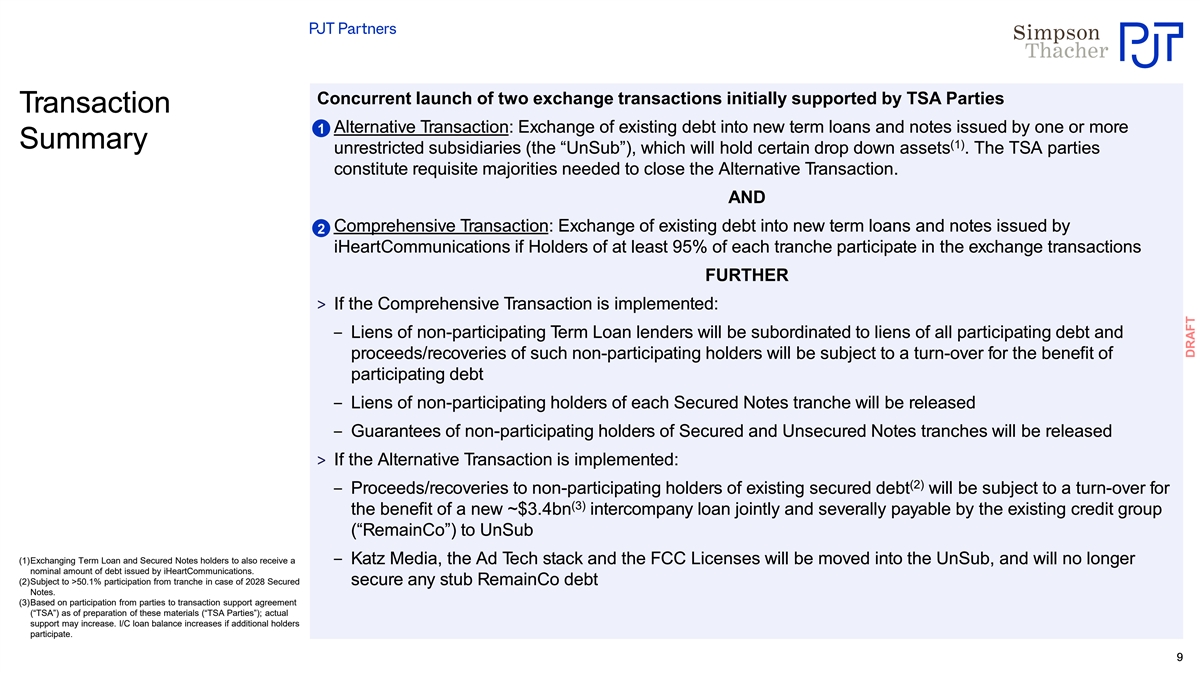 综合交易替代交易交换>收到(i)5c现金,(ii)93.5c新的UnSub债务>收到(i)5c现金和(ii)94c新的有担保期限延长3年的交易,及(iii)0.5c定期贷款/2026年贷款和3年期限延期的票据iHeartCommunications债务有担保票据——最低参与95.0%概览—— TSA各方最低参与>以21c折价兑换成新的2L票据>以21c兑换成新的UNSub 2L票据2027年无担保3年期限延期折扣与3年期限延期票据——最低参与95.0%丨TSA各方最低参与>以12c折价兑换成新的有担保票据,以3年期限延期的12c折价兑换成新的UNSub 1L票据2027年有担保票据——最低参与95.0%丨最低参与TSA各方>以21c折价兑换成新的有担保票据>以21c折价兑换成新的UnSub 1L票据,3年期限延长3年期限延长2028年有担保票据——最低参与95.0% —— TSA各方的最低参与>非参与定期贷款贷款人的留置权将>定期贷款的非参与持有人,并从属于所有参与债务的留置权(1)有担保票据将受制于将其及其和此类非参与回收的收益/回收联合移交给UnSub公司间票据和持有人将受制于参与债务持有> 2027年非参与持有人的担保>各有担保无担保票据的非参与持有人的留置权将被解除的现有信用组分别支付的利益的周转>非参与债务将不会被>有担保票据的非参与持有人的担保:以提前投标的UnSub资产和无担保票据批次投标的持有人所显示的对价将被解除的最后期限。(1)在2028年有担保票据的情况下,须有> 50.1%的分档参与。1 10 0