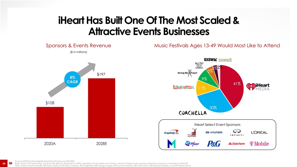 iHeart打造了规模最大、最具吸引力的活动企业之一赞助商和活动收入13-49岁的音乐节最想参加(百万美元)2%% 5% 20 $ 1979% 8% 9% CAGR 41% 11% 10% iHeart Select Event Sponsors 2020A202 E资料来源:IPSOS & iHeartMedia品牌跟踪调查Q2 2023基数:总计13-49不含“以上皆无”回复(n = 492),QuesITFI o cn o:st不是一个因素,你最想参加哪些音乐活动或音乐节?34注:iHeart活动包括:iHR音乐节、iHR音乐奖、iHR Jingle Ball、iHR Wango Tango、iHR Country Festival、iHR ALTER EGO、iHR Podcast Awards、iHR Fiesta Latina