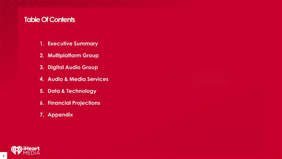免责声明本投资者介绍会(本介绍会)是向对与iHeartMedia,Inc.(iHeartMedia或公司)的潜在交易(潜在交易)表示感兴趣的有限数量的各方提供的。公司不打算让本演示文稿成为任何交易决定的唯一依据。收件人应就任何交易对公司进行自己的调查和分析。本演示文稿仅提供给已与公司就潜在交易签署并交回保密协议(保密协议)的各方。通过接受本演示文稿或本演示文稿的任何部分,收件人同意根据其合规政策、合同义务(包括其保密协议)和适用的法律法规(包括联邦和州证券法)使用和维护本演示文稿中的信息。公司、PJT Partners(“PJT”)、其各自的关联公司或各自的雇员、董事、ont officer racs、to rco s、顾问、顾问、成员、继任者、代表、代理人或控制人或前述的任何代表,均未就本演示文稿或在其对公司进行评估过程中向收件人提供或提供的任何其他信息中所载的任何信息或任何结论的准确性、完整性或公平列报作出任何陈述或保证(明示或暗示),任何一方均不承担因使用或内容本演示文稿或向收件人提供或提供的任何其他此类信息而导致的任何责任,包括对本演示文稿或任何其他书面或口头通讯中包含的任何陈述或保证(明示或暗示)或对本演示文稿或任何其他书面或口头通讯的任何遗漏。唯一将具有任何法律效力且利害关系方可能依赖的信息将包含在规定潜在交易的最终协议中可能包含的陈述和保证中,当、如同和如果执行时,并根据其中可能指定的条款和条件。本演示文稿中的信息由公司提供或来自公开或其他来源。PJT不承担任何独立核实此类信息的责任,并明确表示不对任何接收者承担与此类信息或与公司的任何交易有关的任何责任。本演示文稿不是出售或购买证券的要约,也不是要约的招揽,也不应在此类要约、招揽或出售为非法的任何司法管辖区提供或出售公司或其任何子公司的任何证券。在提供本演示文稿时,公司和PJT保留随时修改或替换本演示文稿的权利,但不承担更新、更正或补充此处包含的任何信息的义务,也不向收件人提供访问任何额外信息的权限。本演示文稿并不旨在包罗万象,也不包含收件人为做出知情投资决定可能需要的所有信息。任何投资或其他财务决策或行动都不应仅基于本演示文稿中的信息。非GAAP措施:除了根据美国公认会计原则(“GAAP”)编制的财务措施外,本演示文稿还包含某些-no GA nAP财务措施,包括EBITDA、调整后EBITDA、调整后EBITDA利润率、分部调整后EBITDA利润率、收入与EBITDA的转换、不包括政治收入的收入、自由现金流和自由现金流转换。该公司认为,分析师和投资者通常使用这些非GAAP财务指标来评估所在行业公司的业绩,而这种非GAAP财务指标有助于投资者评估其运营和财务业绩以及业务趋势,这与管理层评估此类业绩和趋势的方式一致。该公司还认为,这些非美国通用会计准则财务指标可能有助于投资者将其业绩与其他公司的业绩进行比较,尽管其非美国通用会计准则财务指标是公司特有的,其他公司的非美国通用会计准则财务指标可能不会以相同的方式计算。这些非公认会计原则措施应仅被视为补充,而不是替代或优于, 根据公认会计原则编制的财务指标。非GAAP财务指标与最接近的GAAP财务指标之间的调节可在本演示文稿的附录部分中找到。该公司无法在没有不合理努力的情况下提供其非公认会计原则预测与最直接可比的公认会计原则措施之间的对账,因为它无法合理确定地预测对账所需的某些重要项目的最终结果。这些项目是不确定的,取决于各种因素,可能会对GAAP报告的结果产生重大影响。财务预测:本演示文稿包括公司就本公司及其子公司的预期未来业绩编制和提供的某些陈述、索赔、估计、预测和其他信息。本演示文稿中包含的任何假设、观点或意见(包括陈述、预测、预测或其他前瞻性陈述)均代表公司于所示日期的假设、观点或意见,如有更改,恕不另行通知。这些陈述受已知和未知风险、不确定性、环境变化、假设和其他重要因素的影响,其中许多因素超出了我们的控制范围,可能导致实际结果与前瞻性陈述中讨论的结果存在重大且潜在的不利差异。3 3