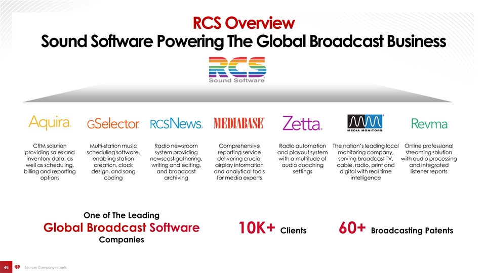 RCS概述Sound Software Powering the Global Broadcast Business CRM Solution Multi-station Music Radio Newsroom Comprehensive Radio Automation全国领先的本地在线专业人员提供销售和调度软件,系统提供报告服务和播放系统监控公司,流式传输解决方案库存数据,作为使能台新闻广播收集,提供与众多服务的广播电视至关重要,具有音频处理以及调度、创建、时钟编写和编辑、airplay信息音频教练电缆、广播、印刷和集成计费和报告设计,和歌曲和广播和分析工具设置数字化与实时听众报告选项编码归档为媒体专家情报全球领先的广播软件之一10K +客户端60 +广播专利公司4646来源:公司报告