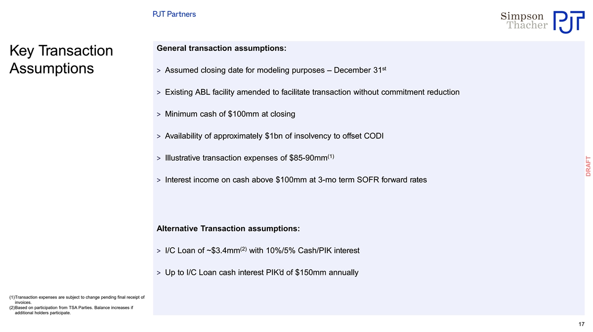 一般交易假设:关键交易ST >为建模目的假设的截止日期– 12月31日假设>现有ABL融资修订以促进交易而不减少承诺>收盘时最低现金为100mm >可获得约10亿美元的无力偿债以抵消CODI(1)> 85-90mm的说明性交易费用>以3个月期限SOFR远期利率计算的100mm以上现金的利息收入替代交易假设:(2)> I/C贷款~3.4mm,10%/5%现金/PIK利息>最高I/C贷款现金利息每年为150mm的PIK’d(1)交易费用可能会在最终收到发票之前发生变化。(2)基于TSA缔约方的参与。如果有更多的持有者参与,余额就会增加。17