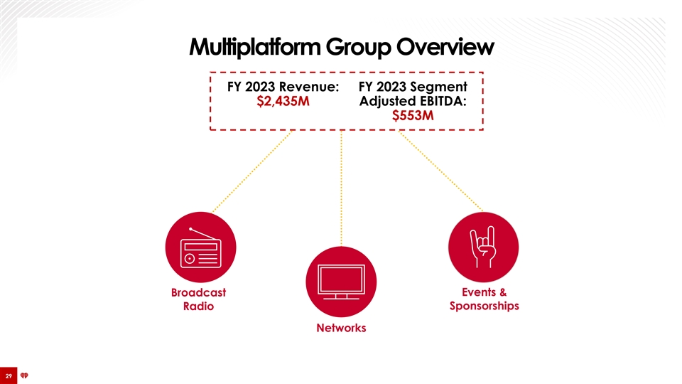多平台集团概览2023财年收入:2023财年分部24.35亿美元调整后EBITDA:5.53亿美元活动和广播电台赞助网络29