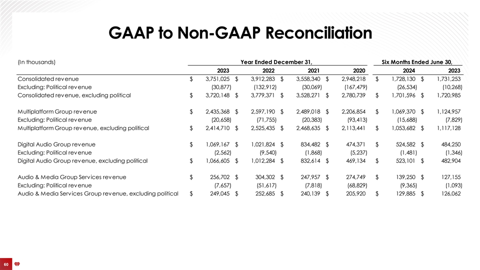 GAAP与Non-GAAP对账(千)截至12月31日的年度、截至2023年6月30日的六个月20222021202020242023合并收入3,751,025美元3,912,283美元3,558,340美元2,948,218美元1,728,130美元1,731,253不包括:政治收入(30,877)(132,912)(30,069)(167,479)(26,534)(10,268)合并收入,不包括政治收入3,720,148美元3,779,371美元3,528,271美元2,780,739美元1,701,596美元1,720,985多平台集团收入2,435,368美元2,597,190美元2,489,018美元2不包括政治2,414,710美元2,525,435美元2,468,635美元2,113,441美元1,053,682美元1,117,128美元数字音频集团收入1,069,167美元1,021,824美元834,482美元474,371美元524,582美元484,250美元不包括:政治收入(2,562)(9,540)(1,868)(5,237)(1,481)(1,346)数字音频集团收入,不包括政治收入1,066,605美元1,012,284美元832,614美元469,134美元523,101美元482,904美元音频和媒体集团服务收入256,702美元304,302美元247,957不包括政治$ 249045 $ 252685 $ 240,139 $ 205,920 $ 129,885 $ 126,06260
