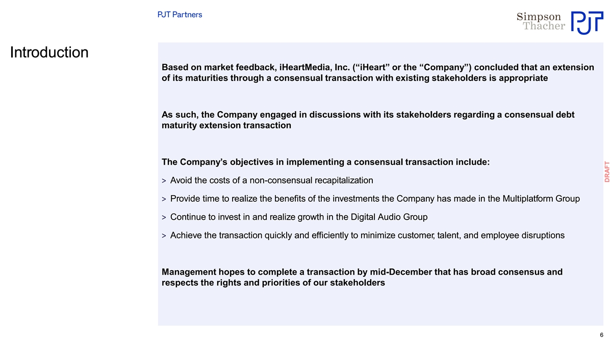 导语根据市场反馈,iHeartMedia,Inc.(“iHeart”或“公司”)得出结论,通过与现有利益相关者协商一致的交易延长其期限是适当的,公司就合意债务期限延长交易与其利益相关者进行了讨论公司实施合意交易的目标包括:>避免非合意资本重组的成本>提供时间实现公司在多平台集团所做投资的收益>继续投资并实现数字音频集团的增长>快速高效地实现交易,以尽量减少客户、人才和员工的干扰管理层希望在12月中旬之前完成一项具有广泛共识并尊重我们利益相关者的权利和优先事项的交易6