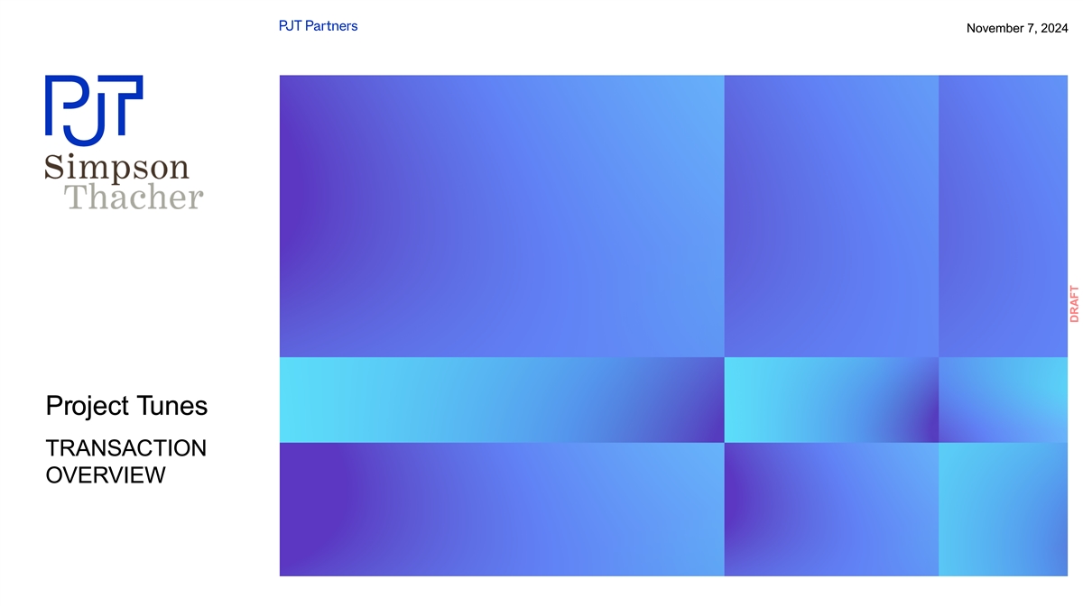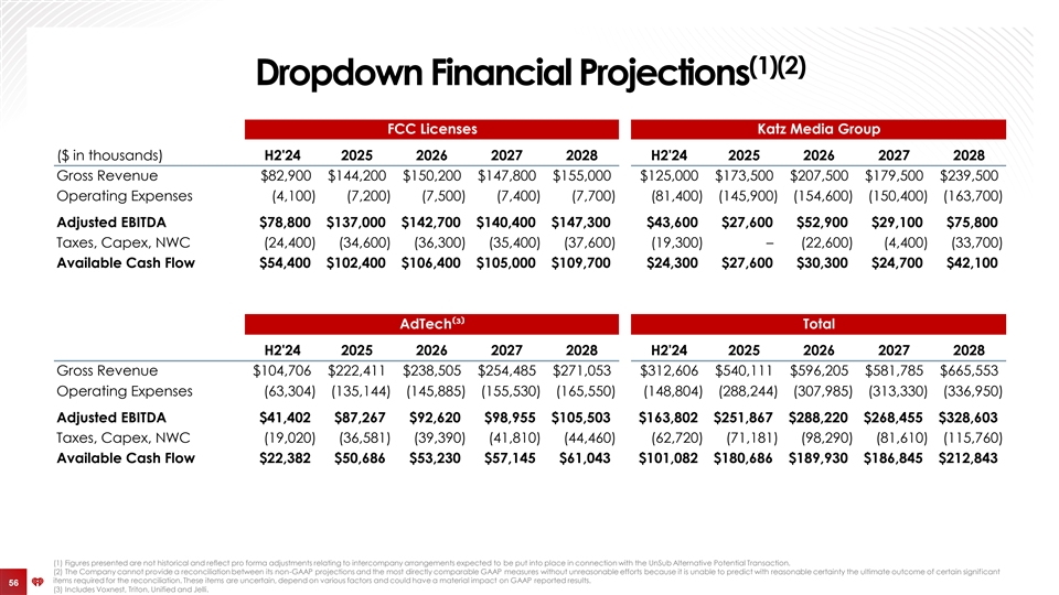 (1)(2)下拉财务预测FCC许可证Katz Media Group(单位:千美元)H2‘24 2025202620272028 H2’24 2025202620272028毛收入82,900美元144,200美元147,800美元155,000美元125,000美元173,500美元179,500美元239,500美元运营费用(4,100)(7,500)(7,400)(81,400)(145,900)(154,600)(150,400)(163,700)调整后EBITDA 78,800美元137,700美元142,700美元147,300美元43,600美元52,900美元29,100美元75,800美元税收、资本支出,NWC(24,400)(34,600)(36,300)(35,400)(37,600)(19,300)–(22,600)(4,400)(33,700)可用现金流$ 54,400 $ 102,400 $ 106,400 $ 105,000 $ 109,700 $ 24,300 $ 27,600 $ 30,300 $ 24,700 $ 42,100 AdTech Volume H2‘24 2025202620272028 H2’24 2025202620272028 Gross revenue $ 104,706 $ 222,411 $ 238,505 $ 254,485 $ 271,053 $ 312,606 $ 540,111 $ 596,205 $ 581,785 $ 665,553 Operating expenses(63,304)(135,144)NWC(19,020)(36,581)(39,390)(41,810)(44,460)(62,720)(71,181)(98,290)(81,610)(115,760)可用现金流22,382美元50,686美元53,230美元57,145美元61,043美元101,082美元180,686美元189,930美元186,845美元212,843美元(1)所列数字不是历史数字,反映了与预期与UNSub替代潜在交易相关的公司间安排相关的备考调整。(2)公司无法在没有不合理努力的情况下提供其非公认会计原则预测与最直接可比的公认会计原则措施之间的调节,因为它无法合理确定地预测调节所需的某些重要项目的最终结果。这些项目是不确定的,取决于各种因素,可能会对GAAP报告的结果产生重大影响。5656(3)包括Voxnest、Triton、Unified和Jelli。