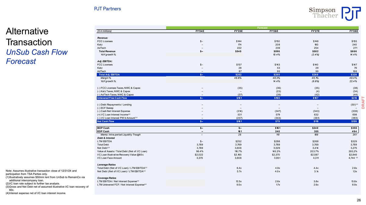 预测(百万美元)FY‘24 E FY’25E FY‘26E FY’27E FY'28E替代收入:FCC Licenses $ – $ 144 $ 150 $ 148 $ 155交易Katz – 174208180240 AdTech – 222239254271总收入$ – $ 540 $ 596 $ 582 $ 666 UNSub现金流同比增长% 10.4%(2.4%)14.4% Adj. EBITDA:预测FCC Licenses $ – $ 137 $ 143 $ 140 $ 147 Katz – 28532976 AdTech – 879399106 Total Adj. EBITDA $ – $ 252 $ 288 $ 268 $ 329 Margin % 46.6% 48.3% 46.1% 49.4% YoY增长% 14.4%(6.9%)22.4%(-)FCC许可证税,NWC & Capex –(35)(36)(35)(38)(-)Katz Taxes,NWC & Capex ––(23)(4)(34)(-)AdTech Taxes,NWC & CAPEX –(37)(39)(42)(44)无杠杆自由现金流$ – $ 181 $ 190 $ 187 $ 213(-)偿还债务/借贷– –– –(50)丨(-)ECF sweep – –– ––(-)现金净利息支出–(314)(347)(343)(339)(+)I/C贷款利息收入² – 531579632698(-)I/C贷款利息PIK金额² –(237)(343)(361)(383)Net cash flow $ – $ 161 $ 79 $ 115 $ 139 BOP cash $ – $ – $ 161 $ 240 $ 355 EOP cash – 1612403494备忘:期内流动性低谷– 25110189261债务和利息LTM EBITDA $ – $ 252 $ 288 $ 268 $ 329总债务3,7693,7693,7693,7693,7693,769净债务² 3,7693,6083,5293,4143,275资产价值/总债务(扣除I/C贷款)96.4% 116.7% 145.3% 203.7% 393.2% I/C贷款说明性回收价值@60c $ 2,022 $ 2,165 $ 2,370 $ 2,587 $ 2,846 I/C贷款面额3,3703,6083,9514,3114,744丨杠杆比率总债务(扣除I/C贷款)/LTM EBITDA ↓ 6.4x 4.9x 4.4x 2.8x注:假设说明性交易收盘价为净债务(扣除I/C贷款)/LTM EBITDA丨5.7x4.0x3.1x1.3x仅来自TSA缔约方的参与。(1)说明性地假设UNSub通过覆盖率向RemainCo借出50mm美元的额外公司间贷款。LTM EBITDA/净利息支出↓ 12.5x 2.6x 3.8x 13.8x(2)I/C贷款利率有待进一步税务分析。LTM无杠杆FCF/净利息费用9.0x 1.7x 2.6x 8.9x(3)毛额和净债务净额假设说明性I/C贷款回收60c。(4)利息支出扣除I/C贷款利息收入。26