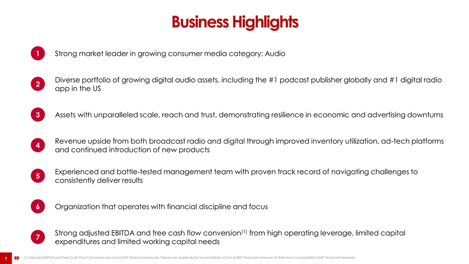 业务亮点1在不断增长的消费媒体类别中拥有强大的市场领导者:音频多样化的数字音频资产组合不断增长,包括全球排名第一的播客发行商和美国排名第一的数字广播2应用程序3种具有无与伦比的规模、影响力和信任度的资产,通过提高库存利用率,在经济和广告低迷时期展示了广播电台和数字部门的收入上行空间,广告技术平台4和持续推出新产品经验丰富且久经沙场的管理团队,在应对挑战方面有着良好的业绩记录,5始终交付成果6以财务纪律和专注运营的组织(1)强劲的调整后EBITDA和自由现金流转换来自高经营杠杆、有限的资本7支出和有限的营运资本需求(1)调整后EBITDA和自由现金流转换是非公认会计准则财务指标。请参阅附录,了解非GAAP财务指标与其最具可比性的GAAP财务指标的对账情况。7
