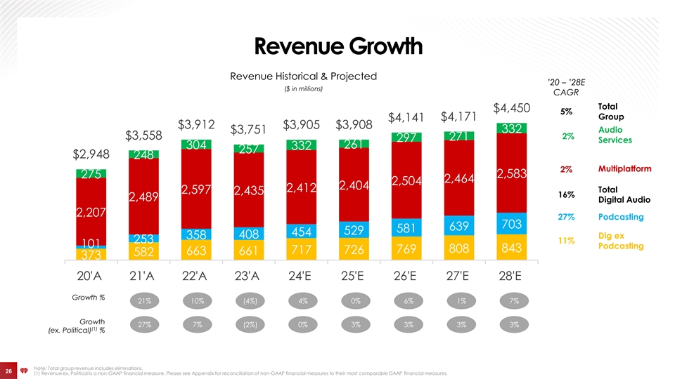 收入增长收入Historical & Projected‘20 –’28E(百万美元)CAGR total $ 4,4505% Group $ 4,171 $ 4,141 $ 3,912 $ 3,905 $ 3,908332 Audio $ 3,751 $ 3,5582% 271297 Services 261304332257 $ 2,9482482% Multiplatform 2,5832752,4642,5042,4042,412 Total 2,5972,43516% 2,489 Digital Audio 2,20727% Podcasting 703639581529454408 Dig ex 35825311% 101 Podcasting 808843769717726663661582373 20‘A 21’A 22‘A 23’A 24‘E 25’3% 3% 3% 3%(1)(ex。政治)%注:集团总收入包括冲销。2626(1)收入ex。政治是一种非公认会计准则财务指标。请参阅附录,了解非GAAP财务指标与其最具可比性的GAAP财务指标的对账情况。