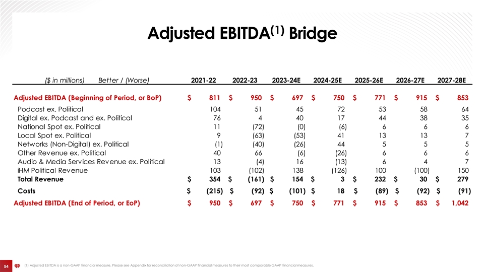 (1)调整后EBITDA桥梁(百万美元)更好/(更差)2021-22 2022-23 2023-24E 2024-25E 2025-26E 2026-27E 2027-28E调整后EBITDA(期初,或BOP)811美元950美元697美元750美元771美元915美元853美元Podcast ex。政治104514572535864数字前。播客和前任。政治7644017443835全国现货ex。政治11(72)(0)(6)666本地现货ex。政治9(63)(53)4113137网络(非数字)ex。政治(1)(40)(26)44555其他收入不含税。政治4066(6)(26)666音频和媒体服务收入ex。政治13(4)16(13)647 iHM政治收入103(102)138(126)100(100)150总收入$ 354 $(161)$ 154 $ 3 $ 232 $ 30 $ 279成本$(215)$(92)$(101)$ 18 $(89)$(92)$(91)调整后EBITDA(期末或EOP)$ 950 $ 697 $ 750 $ 771 $ 915 $ 853 $ 1,042(1)调整后EBITDA是非公认会计准则财务指标。请参阅附录,了解非GAAP财务指标与其最具可比性的GAAP财务指标的对账情况。54