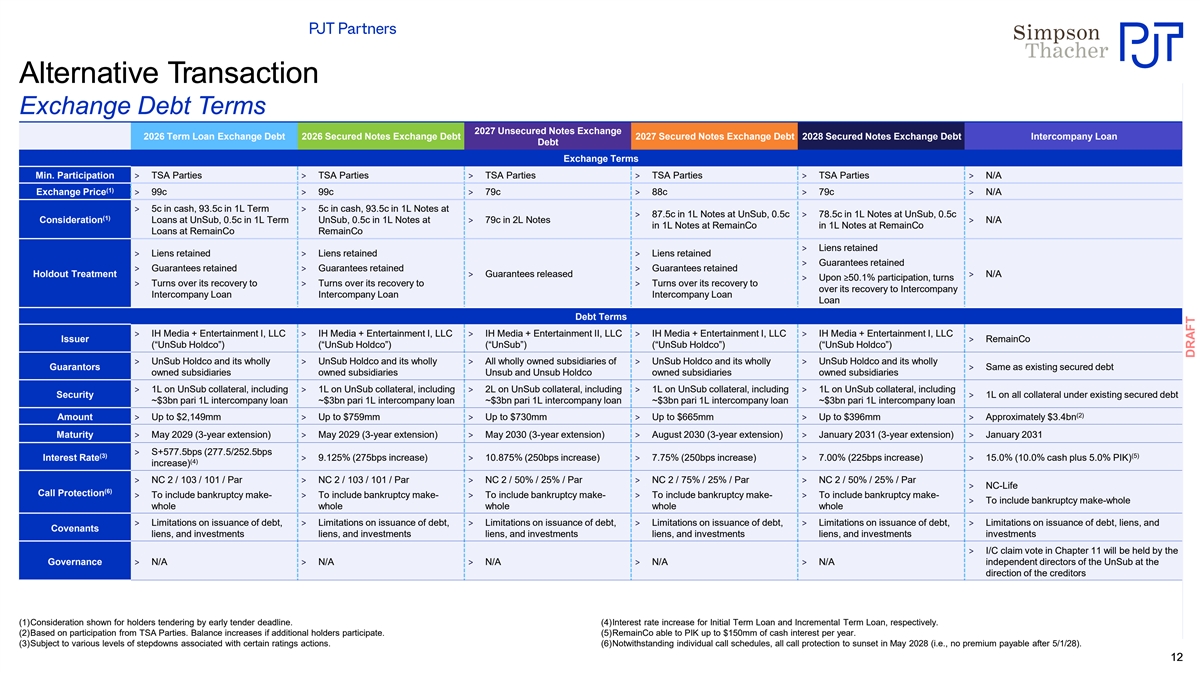 另类交易交换债务条款2027年无担保票据交换2026年定期贷款交换债务2026年有担保票据交换债务2027年有担保票据交换债务2028年有担保票据交换债务公司间贷款债务交换条款最低。参与度> TSA缔约方> TSA缔约方> TSA缔约方> TSA缔约方> TSA缔约方> N/A(1)交换价格> 99c > 99c > 79c > 88c > 79c > N/A > 5c现金,1L期限93.5c > 5c现金,1L票据93.5c > 87.5c在UNSub,0.5c > 78.5c在UNSub的1L票据,0.5c(1)在UNSub的对价贷款,0.5c在1L期限UNSub,0.5c in 1L notes at > 79c in 2L notes > N/A in 1L notes at RemainCo in 1L notes at RemainCo loans at RemainCo RemainCo >留置权>留置权>留置权>留置权>保留担保>保留担保>保留担保>保留担保搁置处理>担保解除>不适用>当≥ 50.1%参与时,turns > Turns over its recovery to > Turns over its recovery to > Turns over its recovery to intercompany intercompany loan intercompany loan intercompany loan intercompany loan loan debt terms > iH Media + Entertainment I,LLC > iH Media + Entertainment I,LLC > iH Media + Entertainment II,LLC > iH Media + Entertainment I,LLC > iH Media + Entertainment I,LLC发行人> RemainCo(“UNSub Holdco”)(“UNSub Holdco”)(“UNSub Holdco”)(“UNSub Holdco”)(“UNSub Holdco”)(“UNSub Holdco”)(“UNSub Holdco”)> UNSub Holdco及其全资> UNSub Holdco及其全资> > UNSub Holdco及其全资子公司> UNSub Holdco及其全资担保人>同现有担保债务拥有的子公司UNSub和UNSub Holdco拥有的子公司拥有的子公司在UNSub抵押品上> 1L,包括在UNSub抵押品上> 1L,包括在UNSub抵押品上> 2L,包括在UNSub抵押品上> 1L,包括现有担保债务下所有抵押品上的证券> 1L~30亿美元同等1L公司间贷款~30亿美元同等1L公司间贷款~30亿美元同等1L公司间贷款~30亿美元同等1L公司间贷款~30亿美元同等1L公司间贷款(2)金额>最高2149mm >最高759mm >最高730mm >最高665mm >最高396mm >约34亿美元到期> 2029年5月(3年展期)> 2029年5月(3年展期)> 2030年5月(3年展期)> 2030年8月(3年展期)> 2031年1月(3年展期)> 2031年1月> S + 577.5bps(277.5/252.5bps(3)(5)利率> 9.125%(275bps增加)> 10.875%(增加250bps)> 7.75%(增加250bps)> 7.00%(增加225bps)> 15.0%(10.0%现金加5.0% PIK)(4)增加)> NC 2/103/101/Par > NC 2/103/101/Par > NC 2/50%/25%/Par > NC 2/75%/25%/Par > NC 2/50%/25%/Par > NC 2/50%/25%/Par > NC-Life(6)Call Protection > to include bankruptcy make-> to include bankruptcy make-> to include bankruptcy make-> to include bankruptcy-> to include bankruptcy minclude bankruptcy make-whole whole whole whole whole >发债的限制,>发债的限制,>发债的限制,>发债的限制,>发债的限制,>发债的限制,留置权,契约留置权,投资留置权,投资留置权,投资留置权,投资留置权,和投资投资>第11章中的I/C债权表决将由治理> N/A > N/A > N/A > N/A > N/A独立董事在债权人的指示下举行UnSub(1)为提前投标截止日期前投标的持有人显示的对价。(4)首期定期贷款和增量定期贷款分别加息。(2)基于TSA缔约方的参与。如果有更多的持有者参与,余额就会增加。(5)RemainCo每年最多能够PIK 150mm的现金利息。(3)受制于与某些评级行动相关的不同程度的降级。(6)尽管有个别电召时间表,所有电召保障至2028年5月日落(即5/1/28后无须缴付保费)。1 12 2