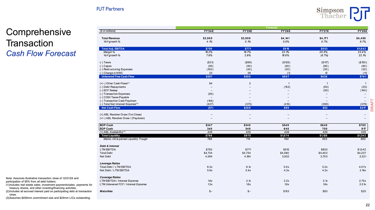 (百万美元)综合来源&使用自由现金流实际预测来源使用交易金融新交换1L债务$ 3,774交换有担保新兴债务$ 2,766 2022A 2023A 2024E 2025E 2026E 2027E 2028E新交换2L债务694交换出现后债务1,188贴现捕获356交换无担保新兴债务871收入$ 3,912 $ 3,751 $ 3,905 $ 3,908 $ 4,141 $ 4,171 $ 4,450非现金来源摘要$ 4,824非现金使用$ 4,824 ABL提款– TL/' 26 SSN期末本金偿还146调整后EBITDA $ 950 $ 697 $ 750 $ 771 $ 915 $ 853 $ 1,042(按95%参与)B/S前现金(截至12/费用44%利润率24.3% 18.6% 19.2% 19.7% 22.1% 20.5% 23.4%交易费用85 CODI应缴税款丨–(-)税款($ 35)($ 11)($ 31)($ 99)($ 126)($ 117)($ 150)B/S 339的TXN后现金(-)资本支出(161)(103)(95)(90)(90)(90)(90)总来源$ 5,438总使用$ 5,438(-)重组费用(76)(60)(100)(40)(30)(30)备忘:PF收盘时流动性$ 766(-)NWC变化(10)(19)3338(1)12(11)无杠杆TERM0 FCFProfile current Pro Forma Levered FCF $ 326 $ 111 $ 130 $ 207 $ 251 $ 229 $ 381(-)非交换债务到期(299)(147)––(153)(83)(25)$ 3,000(-)TERM0扫一扫–– ––(95)(140)(-)交易费用––(85)–– ––(-)TL/' 26 SSN本金偿还––(146)–– –– 2500(+)Txn ABL提款–– –– ––(+/-)ABL提款/(还款)–– –– –– ––(+)其他现金流↓(42)47942111 2,000净现金流(16美元)$ 10($ 7)$ 209 $ 99 $ 52 $ 217(+)起始现金353337347340549648700期末现金$ 337 $ 346 $ 340 $ 549 $ 648 $ 700 $ 9171,500(+)ABL可用性426426426426426426426426426总流动性$ 763 $ 772 $ 766 $ 975 $ 1,074 $ 1,126 $ 1,343备忘:流动性低谷7667147608538651,000信用统计注:假设说明性交易结束时间为12/31/24。交易实际预测费用已扣除已支付金额,并可能发生变化2022A 2023A 2024E 2025E 2026E 2027E 2028E 500待最终收到发票。注:假设TSA各方收到TSA费用,该费用应作为总债务$ 5,440 $ 5,236 $ 4,734 $ 4,734 $ 4,580 $ 4,402 $ 4,237 1pt的债务支付。净债务总额5,1034,8904,3944,1843,9323,7033,321(1)正在进行CODI分析;对于CODI的高度说明性估计包括0种假设,包括25.6%的税率、估计的备考信贷统计202620272028202920302031202620272028202920302031交易价格,以及可用约10亿美元的无力偿债能力抵减总债务/调整后EBITDA 5.7x 7.5x 6.3x 6.1x 5.0 x 5.2x 4.1x抵消CODI。净债务/Adj. EBITDA 5.4x 7.0x 5.9x 5.4x 4.3x 4.3x 3.2x(2)包括按3个月期限SOFR2026 TL2026 Incr计的100mm以上现金的利息收入。TL 2026票据2027票据2028票据2027 Uns。调整后EBITDA/净现金利息2.8x 1.8x 1.8x 2.1x 2.2x 2.1x 2.7x远期利率。UFCF/净现金利息2.0x 1.3x 1.3x 1.6x 1.6x 1.6x 2.0x(3)包括房地产销售、投资付款/销售、库存股付款以及其他投资/融资活动。21