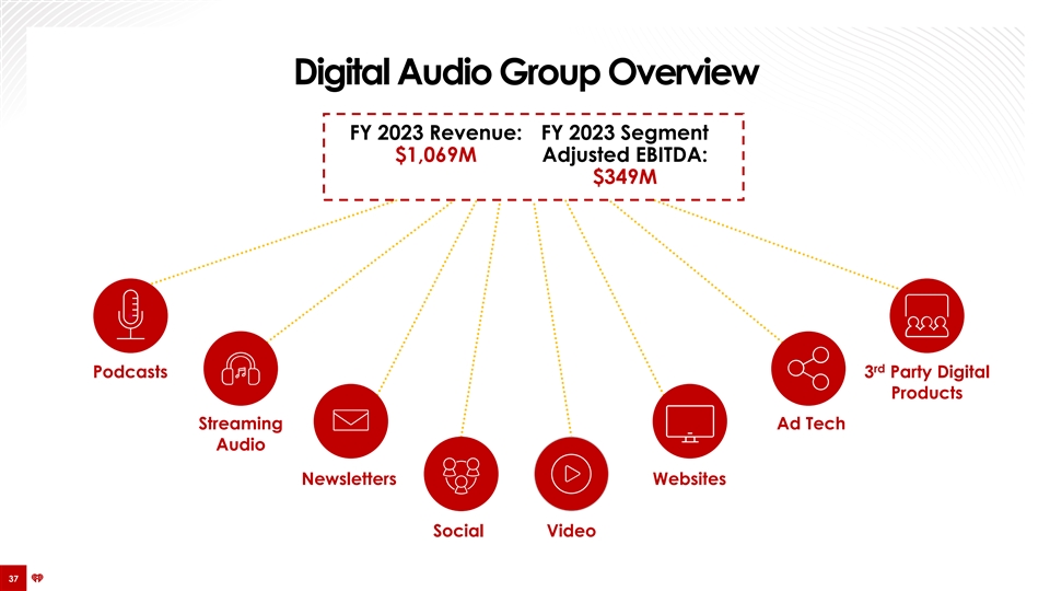 数字音频集团概览2023财年收入:2023财年分部10.69亿美元调整后EBITDA:3.49亿美元• rd Podcasts 3 Party Digital Products Streaming Ad Tech Audio Newsletters Websites Social Video 37