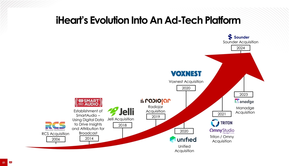 iHeart向Ad-Tech平台Sounder Acquisition的演变2024 Voxnest Acquisition 20202023 Radiojar Manadge建立Acquisition Acquisition 2021 SmartAudio – 2019 Jelli Acquisition使用数字数据驱动Insights 2018和2020归因广播RCS Acquisition Triton/Omny20142006 Acquisition Unified Acquisition 51