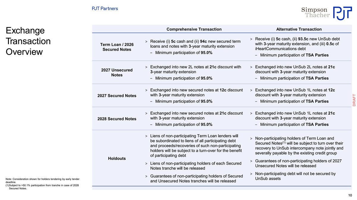 同时推出两项最初由TSA各方支持的交换交易Transaction > Alternative Transaction:将现有债务交换为新的定期贷款和由一个或多个子公司发行的票据1摘要(1)非限制性子公司(“UNSub”),这些子公司将持有一定的下拉资产。TSA各方构成完成替代交易所需的必要多数。及>综合交易:将现有债务交换为新定期贷款及2 iHeartCommunications发行的票据如果每一档至少95%的持有人参与交换交易进一步>如果综合交易得以实施:丨非参与定期贷款贷款人的留置权将从属于所有参与债务的留置权,并且此类非参与持有人的收益/回收将为参与债务的利益而进行周转丨每一档有担保票据的非参与持有人的留置权将被解除丨非参与有担保持有人的担保和无担保票据部分将被释放>如果替代交易得以实施:(2)丨向现有有担保债务的非参与持有人的收益/追偿将受制于(3)由现有信贷集团(“RemainCo”)共同和分别支付给UNSub的新的约34亿美元公司间贷款的利益(1)交换定期贷款和有担保票据持有人也将获得丨Katz Media,Ad Tech堆栈和FCC许可证将被移入UNSub,并且将不再是iHeartCommunications发行的债务的名义金额。(2)在2028年有担保担保的情况下,任何存根RemainCo债务票据的参与比例须高于50.1%。(3)基于截至准备这些材料时交易支持协议(“TSA”)缔约方的参与情况(“TSA缔约方”);实际支持可能会增加。如果有额外的持有者参与,I/C贷款余额就会增加。9 9