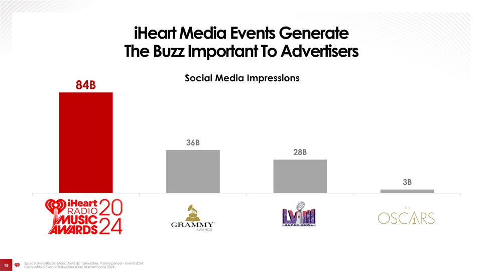 iHeart媒体活动产生对广告商很重要的嗡嗡声社交媒体印象84B 36B 28B 3B iHeartRadio音乐奖格莱美超级碗奥斯卡奖来源:iHeartRadio音乐奖:Talkwalker,宣传期–活动20241818竞争性活动:Talkwalker(仅限活动日)2024