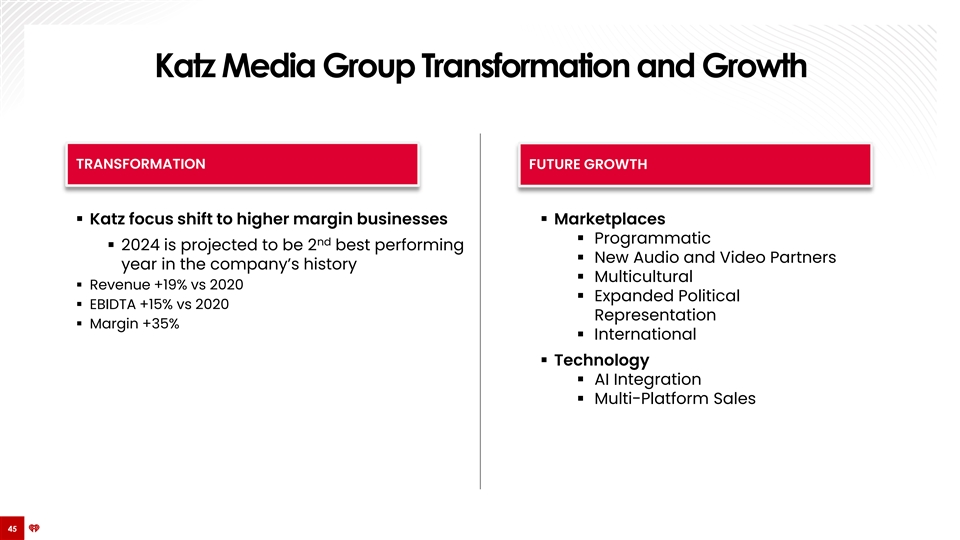 Katz Media Group转型和增长转型未来增长▪Katz重点转向利润率更高的业务▪市场▪程序化nd▪预计2024年将是表现最好的2个▪公司历史上新的音视频合作伙伴年▪多文化▪营收+ 19%较2020年▪扩大政治▪EBIDTA + 15%与2020年的代表性▪利润率+ 35%▪国际▪技术▪AI集成▪多平台销售45